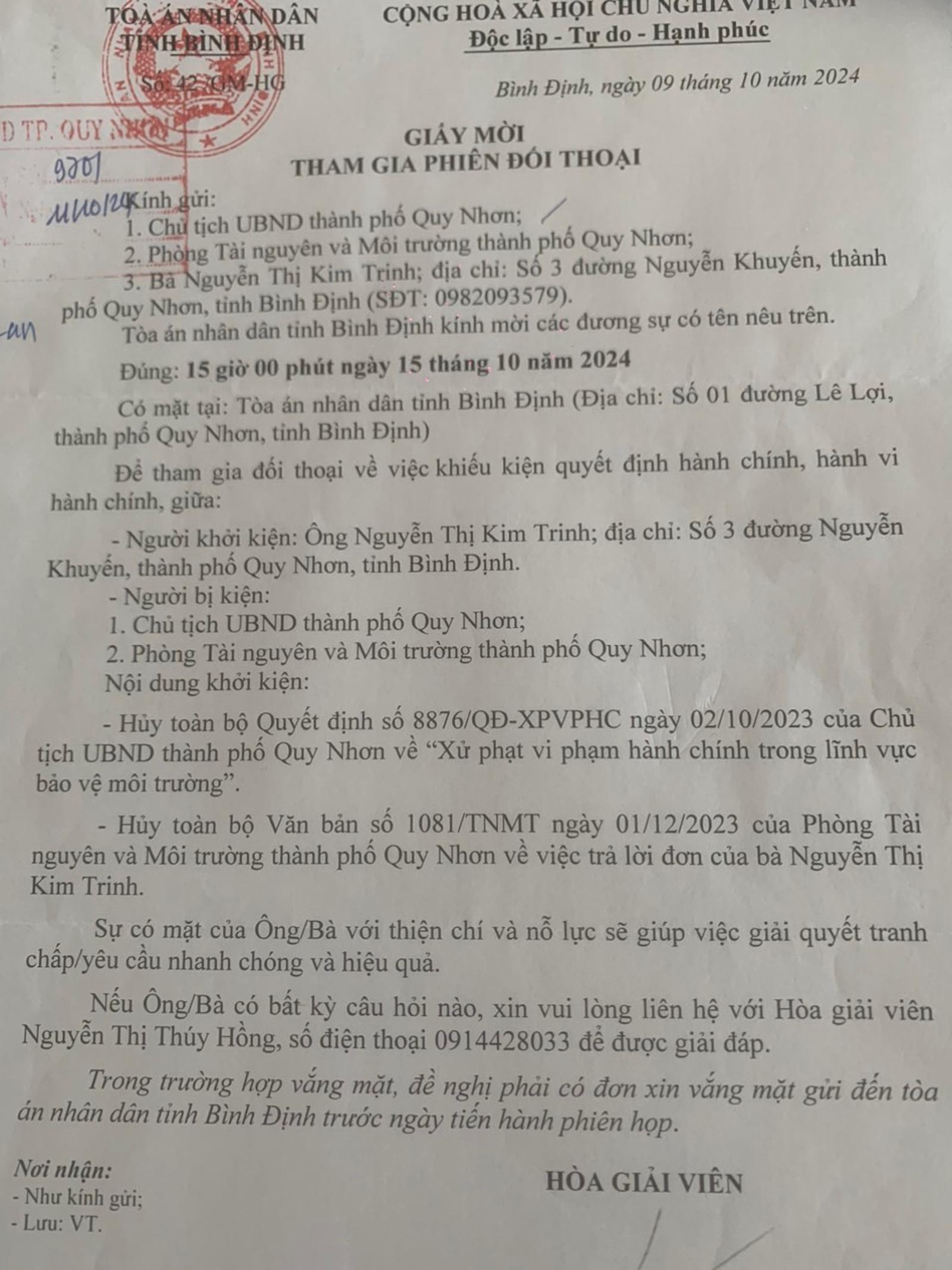Tại buổi làm việc, Phòng TNMT TP Quy Nhơn đã cung cấp cho chúng tôi giấy mời tham gia phiên đối thoại với nội dung: Chủ cơ sở chế biến mực Kim Trinh khiếu kiện Chủ tịch UBND TP Quy Nhơn và Phòng TNMT TP Quy Nhơn với nội dung khởi kiện, hủy toàn bộ Quyết định số 8876/QĐ-XPVPHC ngày 2/10/2023 của Chủ tịch UBND TP Quy Nhơn về “xử phạt vi phạm hành chính trong lĩnh vực bảo vệ môi trường và hủy toàn bộ Văn bản số 1081/TNMT ngày 1/12/2023 của Phòng TNMT TP Quy Nhơn về việc trả lời đơn của bà Nguyễn Thị Kim Trinh".