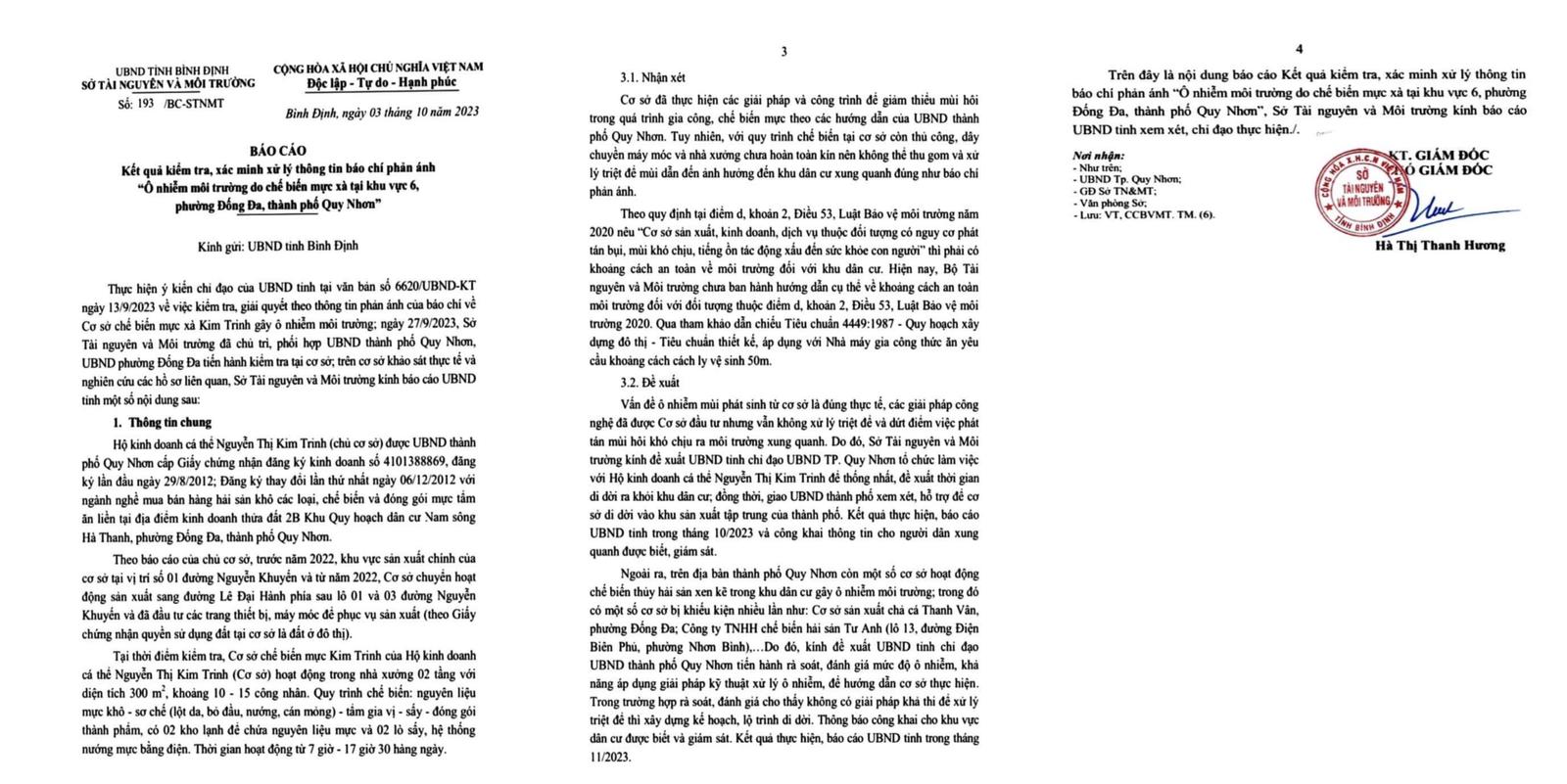 Theo “báo cáo kết quả kiểm tra, xác minh xử lý thông tin báo chí phản ánh ô nhiễm môi trường do chế biến mực xà tại khu phố 6, phường Đống Đa, thành phố Quy Nhơn” ngày 3/10/2023 của Sở Tài nguyên và Môi trường (TNMT) tỉnh Bình Định, thể hiện: Cơ sở đã thực hiện các giải pháp và công trình để giảm thiểu mùi hôi trong quá trình gia công, chế biến mực theo các hướng dẫn của UBND thành phố Quy Nhơn. Tuy nhiên, với quy trình chế biến tại cơ sở còn thủ công, dây chuyền máy móc và nhà xưởng chưa hoàn toàn kín nên không thể thu gom và xử lý triệt để mùi, dẫn đến ảnh hưởng đến khu dân cư xung quanh, đúng như báo chí phản ánh.