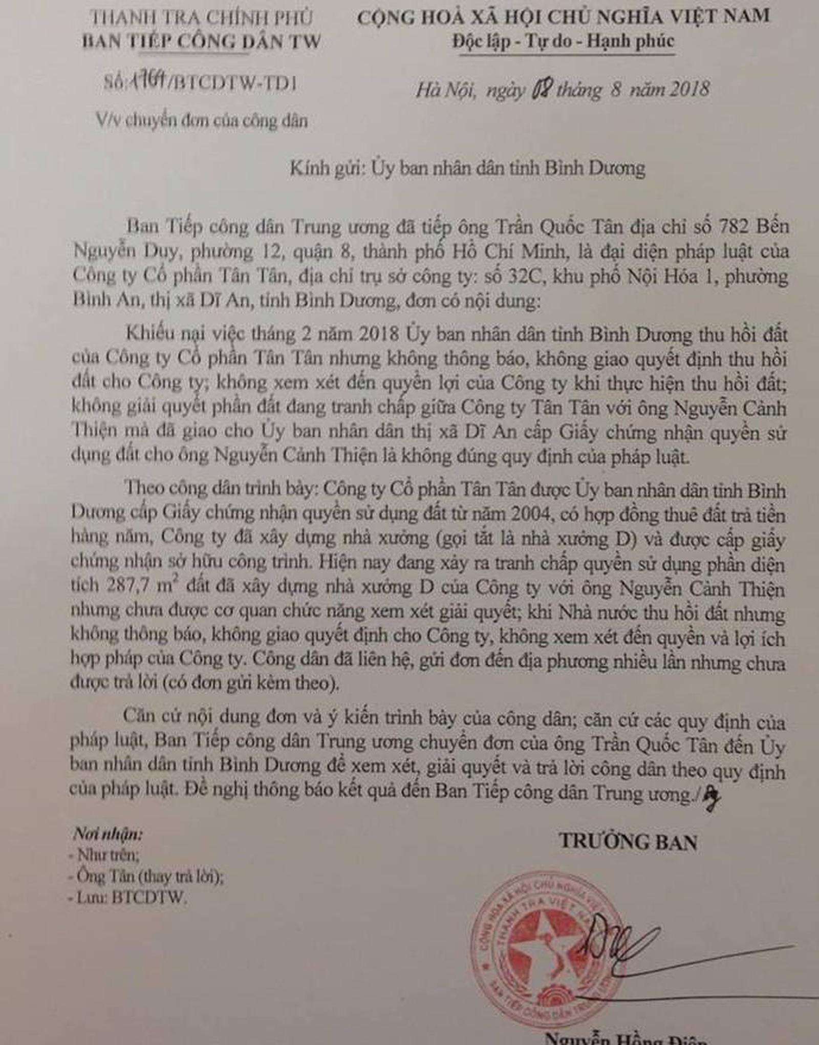 Ngày 08/8/2018, Ban Tiếp công dân Trung ương có Văn bản số 1764/BTDTW-TDI về việc chuyển đơn khiếu nại của ông Trần Quốc Tân đến UBND tỉnh Bình Dương xem xét giải quyết trả lời công dân đúng pháp luật. Đề nghị thông báo kết quả đến Ban Tiếp công dân Trung ương.