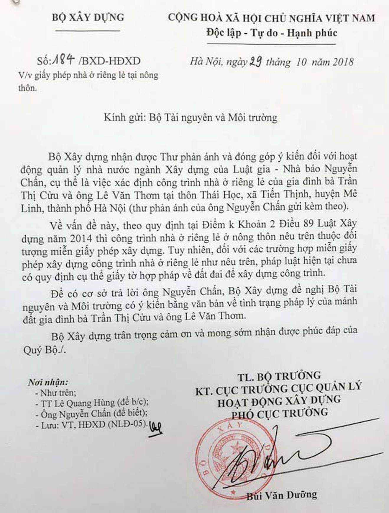 Ngày 29/10/2018, Bộ Xây dựng tiếp tục có Công văn số 184/BXD-HĐXD (do Phó Cục trưởng Cục Quản lý hoạt động xây dựng Bùi Văn Dưỡng ký) gửi Bộ Tài nguyên và Môi trường với nội dung:“Bộ Xây dựng nhận được thư phản ánh và đóng góp ý kiến đối với hoạt động quản lý Nhà nước ngành Xây dựng của Luật gia- Nhà báo Nguyễn Chấn, cụ thể là việc xác định công trình nhà ở riêng lẻ của gia đình bà Trần Thị Cửu và ông Lê Văn Thơm tại thôn Thái Học, xã Tiến Thịnh, huyện Mê Linh, TP Hà Nội (thư phản ánh của ông Nguyễn Chấn kèm theo). Về vấn đề này, theo quy định tại Điểm k Khoản 2 Điều 89 Luật Xây dựng năm 2014 thì công trình nhà ở riêng lẻ ở nông thôn nêu trên thuộc đối tượng miễn giấy phép xây dựng. Tuy nhiên, đối với các trường hợp miễn giấy phép xây dựng công trình nhà ở riêng lẻ như nêu trên, pháp luật hiện tại chưa có quy định cụ thể giấy tờ hợp pháp về đất đai để xây dựng công trình. Để có cơ sở trả lời ông Nguyễn Chấn, Bộ Xây dựng đề nghị Bộ Tài nguyên và Môi trường có ý kiến bằng văn bản về tình trạng pháp lý của mảnh đất gia đình bà Trần Thị Cửu và ông Lê Văn Thơm. Bộ Xây dựng trân trọng cảm ơn và mong muốn sớm nhận được phúc đáp của Quý Bộ”.