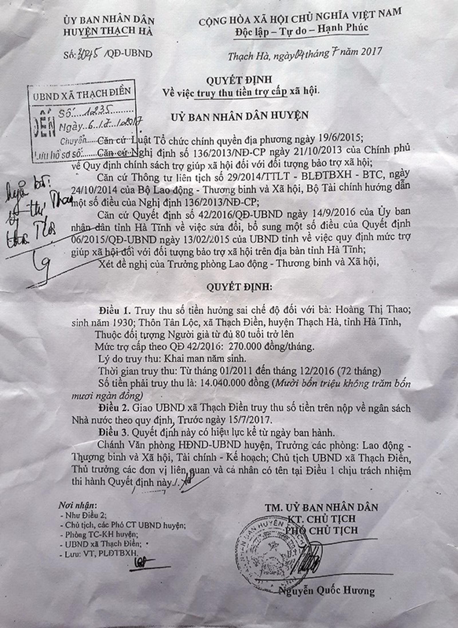 Sau khi tiến hành kiểm tra, mới đây, UBND huyện Thạch Hà đã ra quyết định truy thu số tiền hưởng sai chế độ đối với bà Hoàng Thị Thao số tiền là 14.040.000 đồng vì khai man năm sinh.