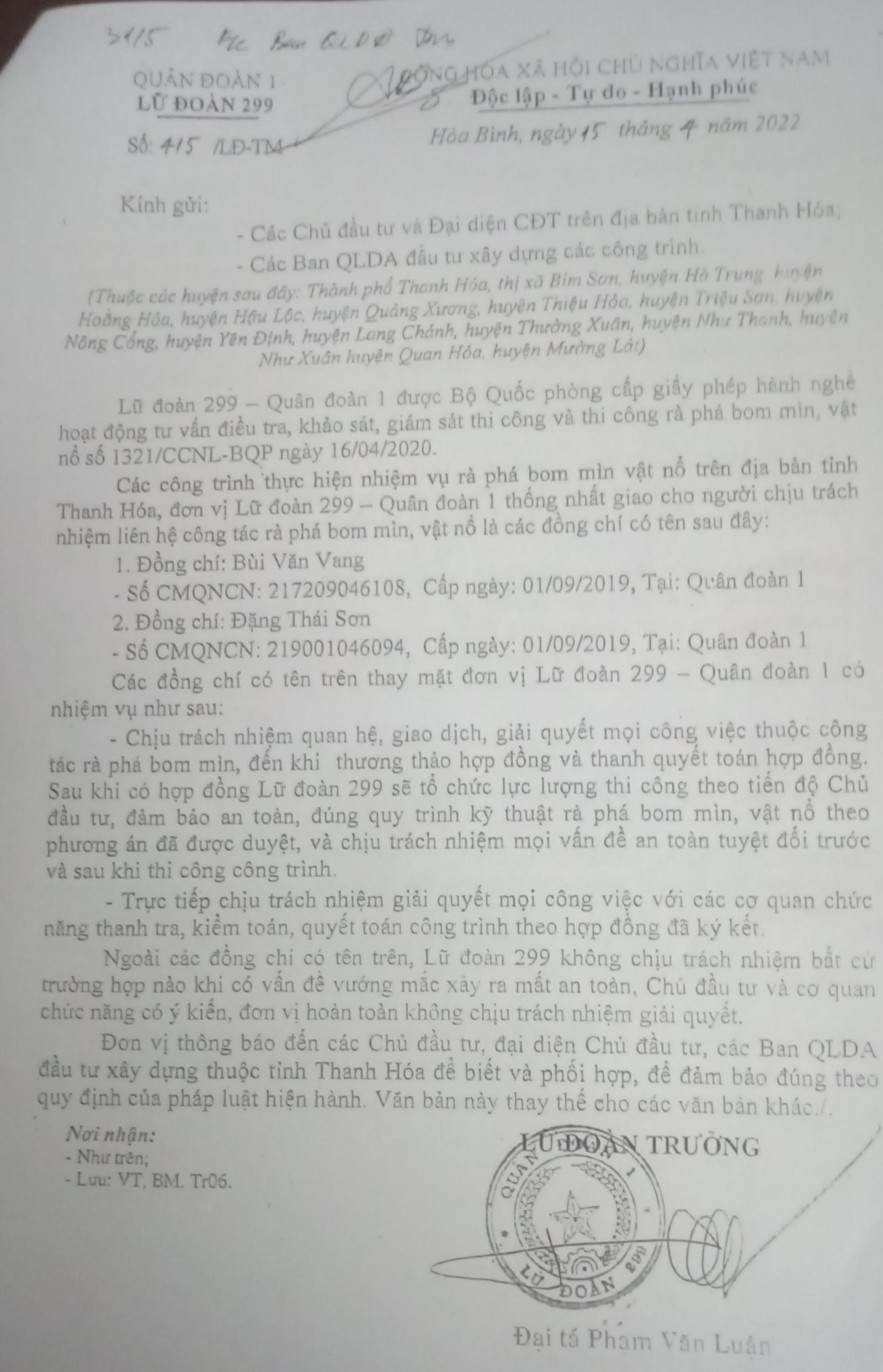 2 cá nhân có tên nói trên không phải là cán bộ của đơn vị nên không được giao nhiệm vụ giao dịch rà phá bom mìn, vật nổ. Trên địa bàn Thanh Hóa chỉ giao nhiệm vụ đích danh cho 2 đồng chí có tên trong Văn bản số 415/LĐ-TM ngày 15/4/2022 của Lữ đoàn 299, Quân đoàn 1.