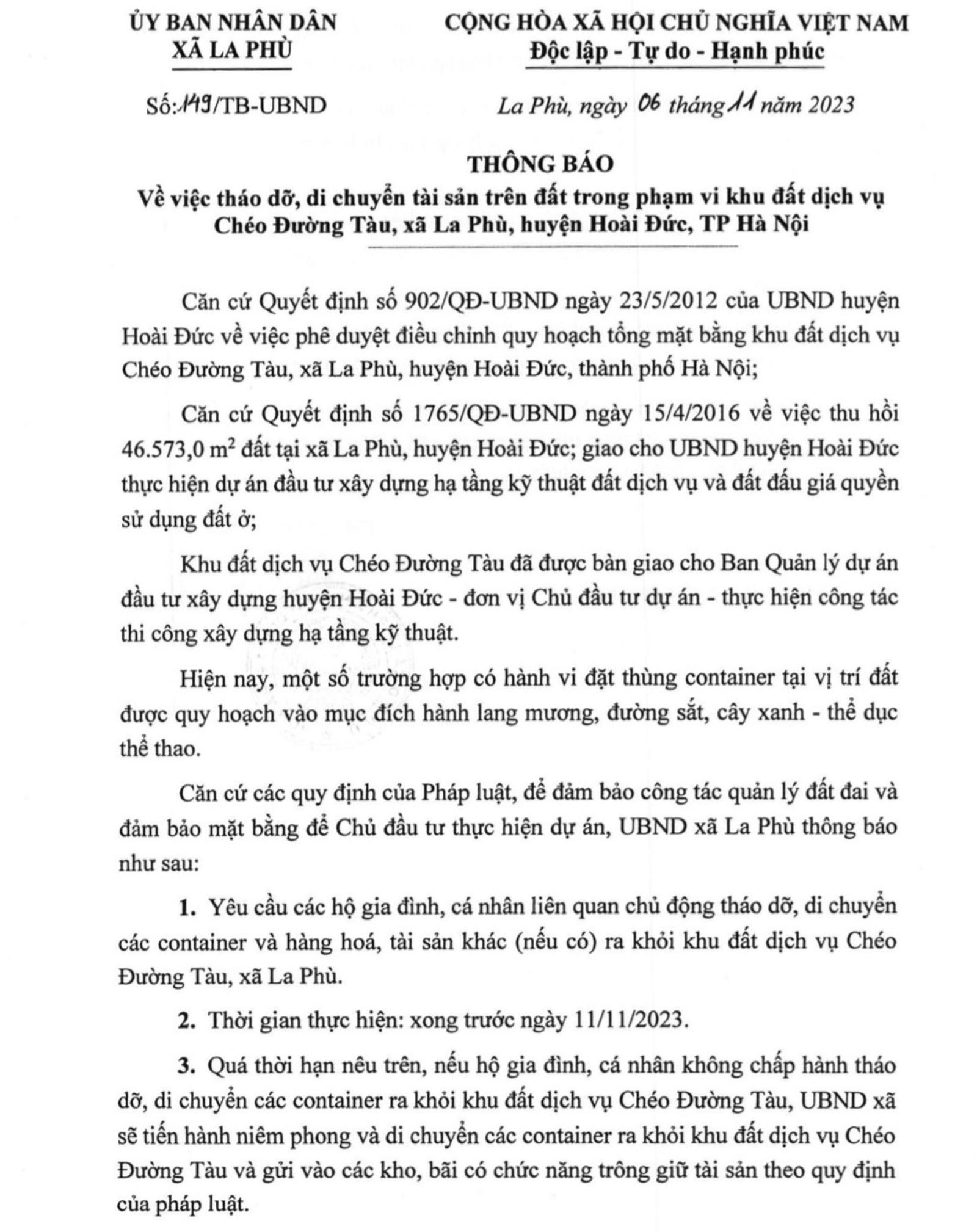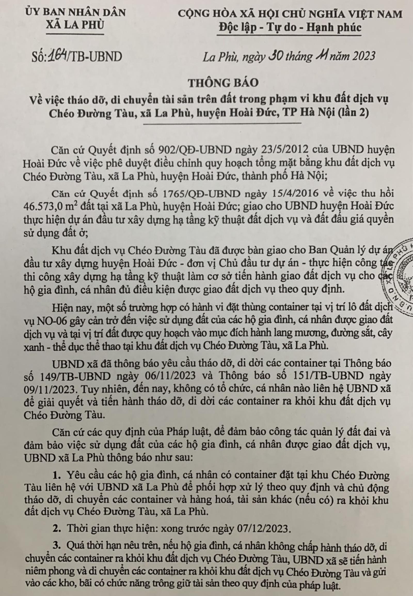 Thông báo số 149/TB-UBND ngày 06/11/2023 của UBND xã La Phù đã chỉ rõ thời hạn thực hiện đưa các container ra khỏi nơi tập kết xong trước ngày 11/11/2023, nếu các hộ gia đình, cá nhân không di chuyển thì UBND xã sẽ tiến hành niêm phong và di chuyển các container ra khỏi khu đất dịch vụ Chéo Đường Tàu và gửi vào các kho, bãi có chức năng trông giữ tài sản theo quy định của pháp luật.