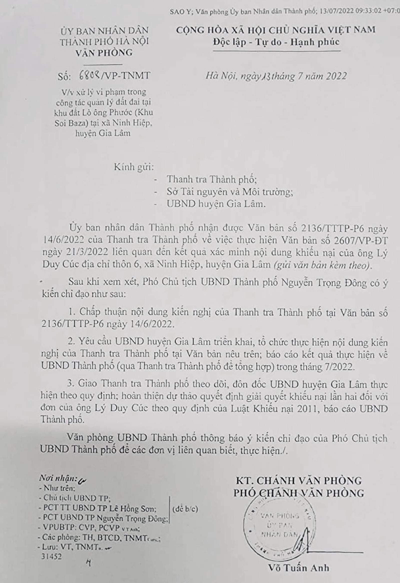 Ngày 13/7/2022, UBND TP Hà Nội có Văn bản số 6808 gửi Thanh tra TP; Sở TN&MT và UBND huyện Gia Lâm chấp thuận nội dung kiến nghị của Thanh tra TP tại Văn bản số 2136 ngày 14/6/2022.
