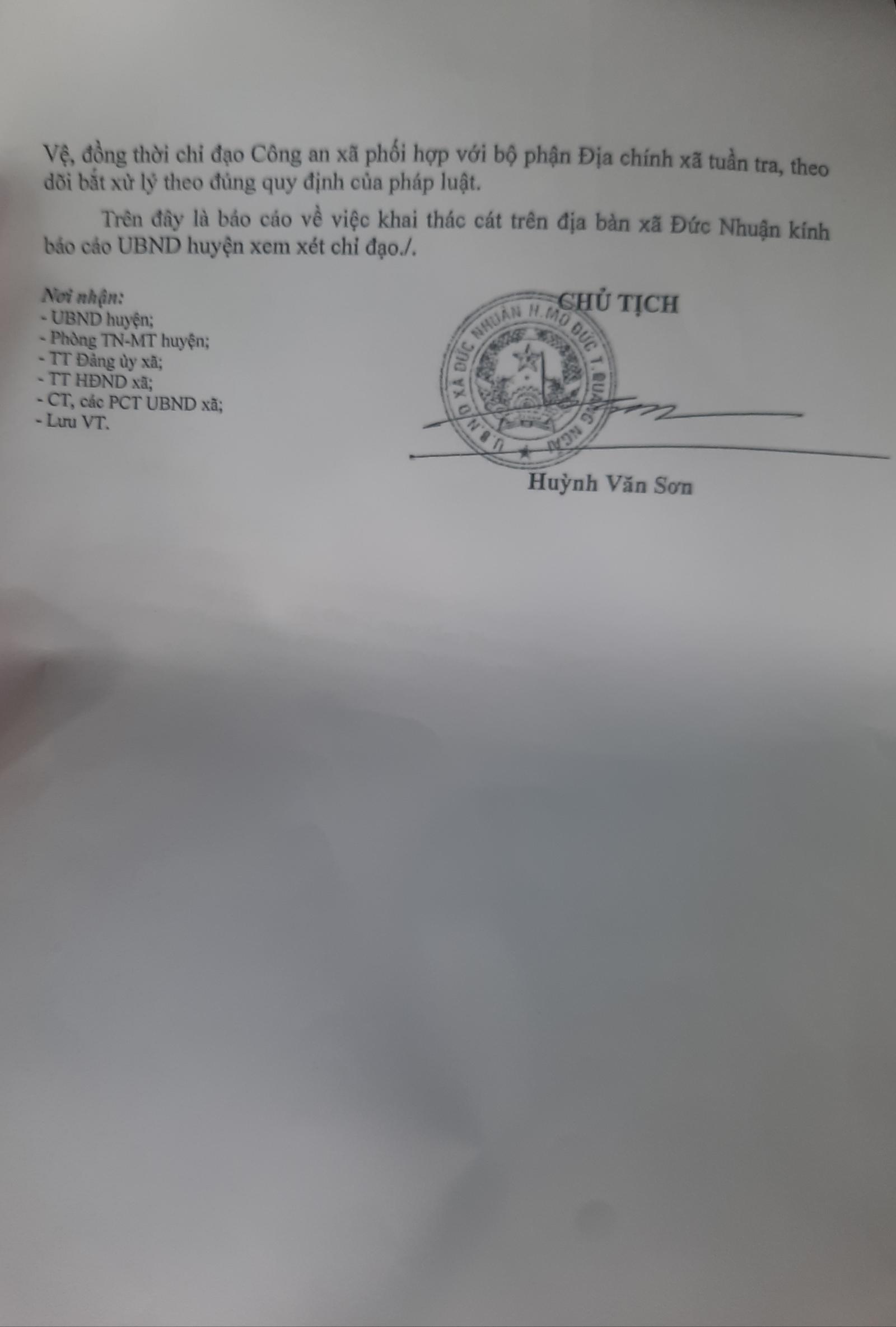 Báo cáo 22/BC-UBND ngày 14/3/2022 của UBND xã Đức Nhuận về việc khai thác cát trên địa bàn xã. Ảnh: P.T