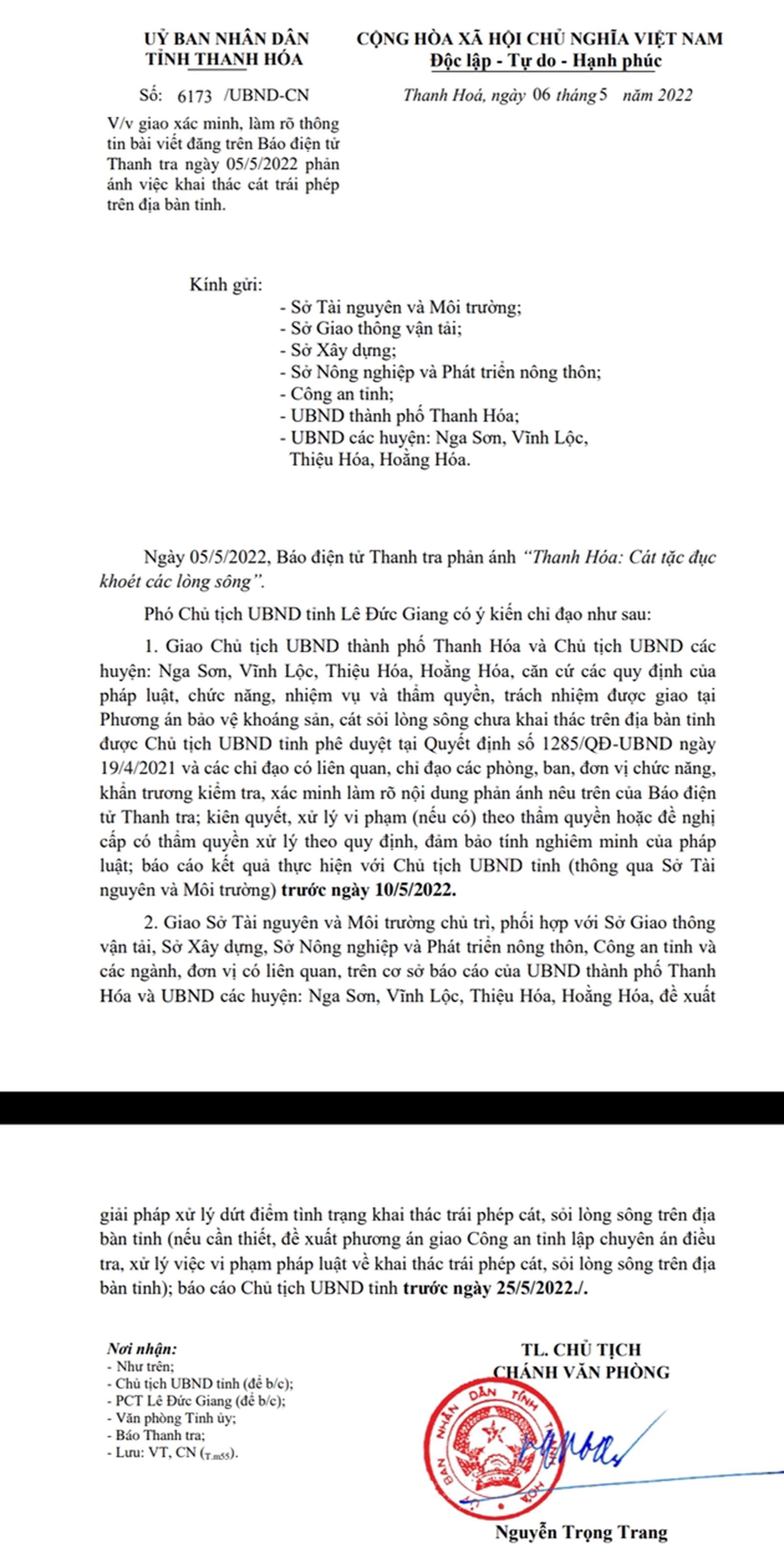 Ngoài ra, lãnh đạo UBND tỉnh Thanh Hóa còn giao Sở Tài nguyên và Môi trường chủ trì với Sở Giao thông Vận tải, Xây dựng, Nông nghiệp và Phát triển nông thôn, Công an tỉnh và các ngành đơn vị có liên quan, trên cơ sở báo cáo của các đơn vị liên quan, đề xuất giải pháp xử lý dứt điểm tình trạng khai thác cát, sỏi lòng sông trên địa bàn tỉnh, nếu cần thiết, đề xuất phương án giao Công an tỉnh lập chuyên án điều tra, xử lý việc vi phạm pháp luật việc khai thác cát sỏi trên địa bàn, báo cáo Chủ tịch UBND tỉnh trước ngày 25/5/2022.