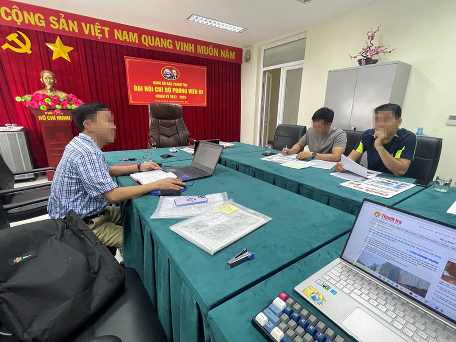 Cán bộ của Phòng Cảnh sát hình sự, Công an TP HCM (bên phải) làm việc, thu thập chứng cứ có liên quan đến nhóm đối tượng giang hồ “đe dọa” lãnh đạo Báo Thanh tra. Ảnh: P.V.