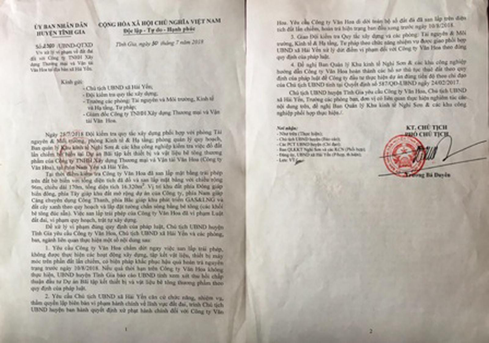 Ngày 30/7/2018, UBND huyện Tĩnh Gia có Văn bản số 2380/UBND-QTXD về việc xử lý vi phạm về đất đai đối với Cty Văn Hoa.