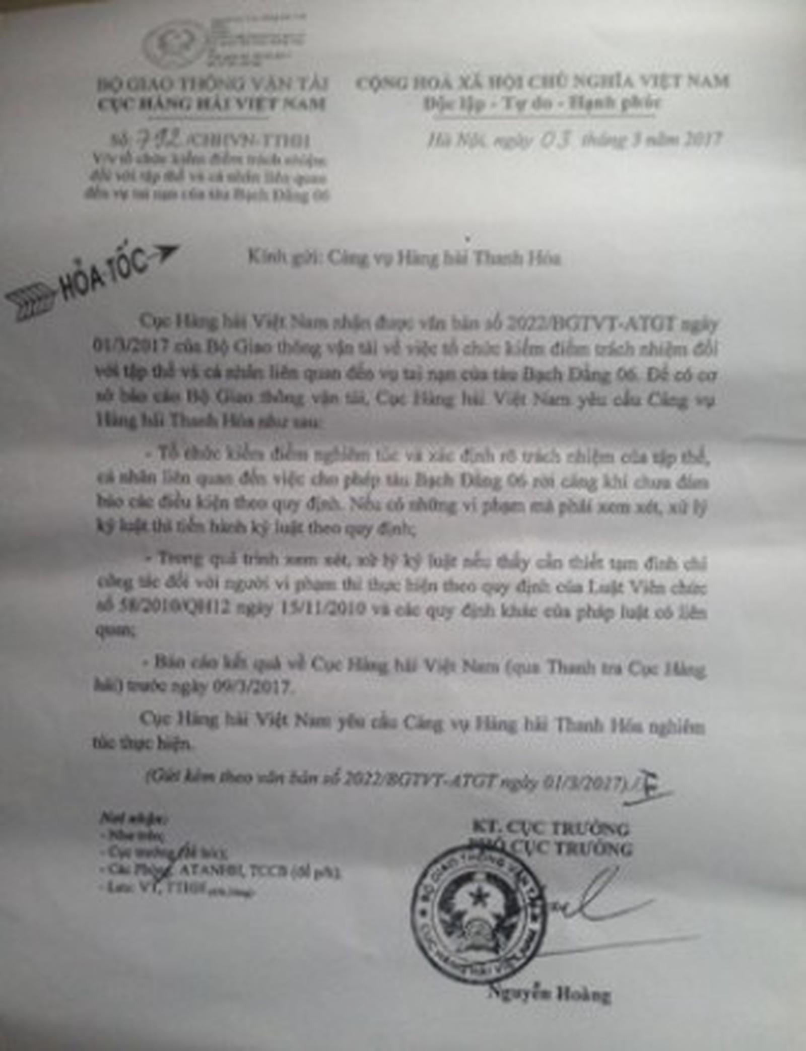 Tại Công văn hỏa tốc số 792/CHHVN-TTHH ngày 3/3/2017 của Cục Hàng hải Việt Nam yêu cầu Cảng vụ Hàng hải Thanh Hóa tổ chức kiểm điểm nghiêm túc và xác định rõ trách nhiệm của tập thể, cá nhân liên quan đến việc cho phép tàu Bạch Đằng 06 rời cảng khi chưa đảm bảo các điều kiện theo quy định… và báo cáo kết quả về Cục Hàng hải Việt Nam trước ngày 9/3/2017.