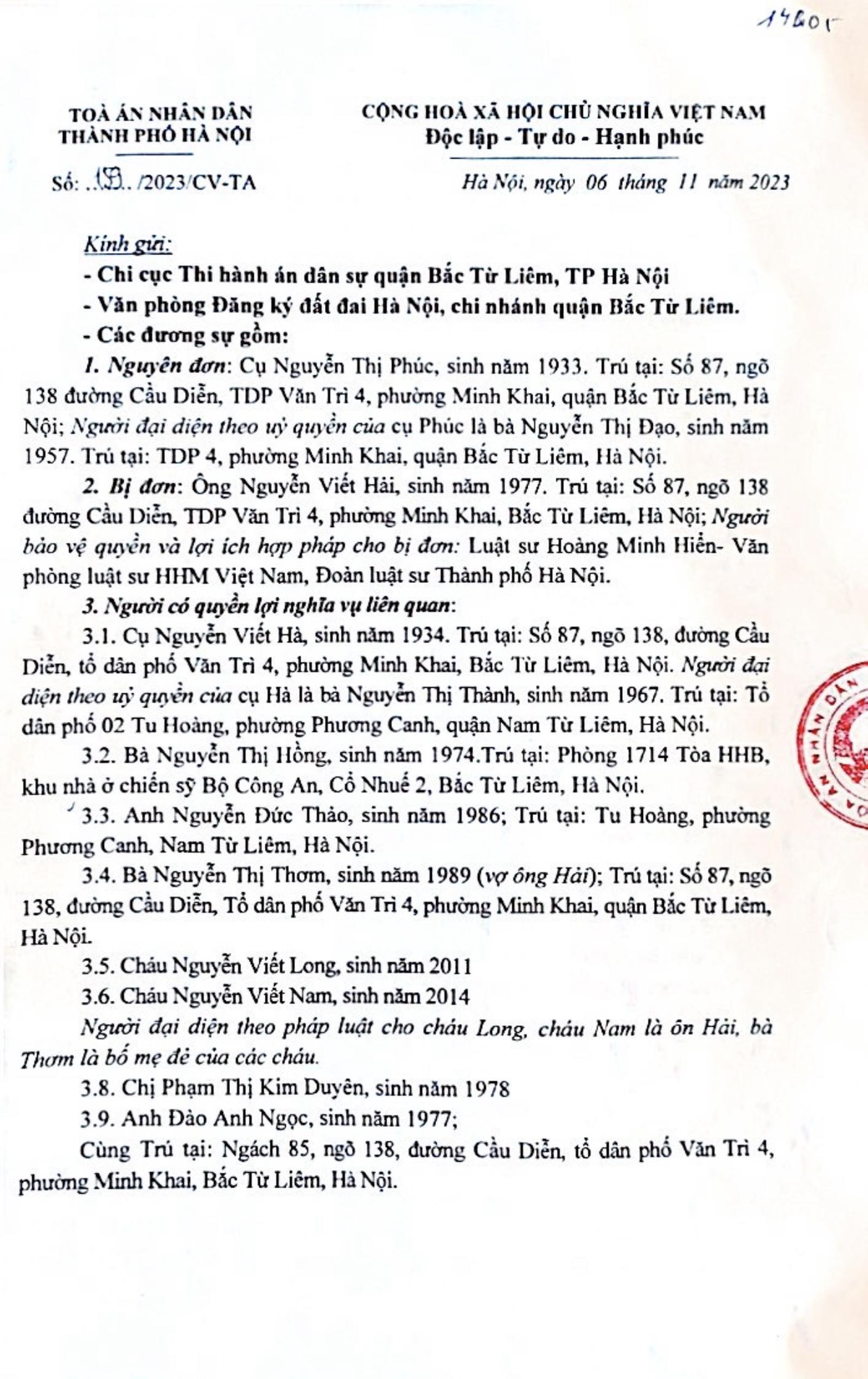 Ngày 13/3/2023, ông Nguyễn Viết Hải có đơn gửi Chi cục THADS quận Bắc Từ Liêm đề nghị thi hành Bản án số 61/2022/DS-PT ngày 22/03/2022; Quyết định sửa chữa, bổ sung bản án phúc thẩm số 209/2022/QĐ-TA ngày 19/7/2022 của TAND TP Hà Nội do thẩm phán - chủ toạ phiên toà Đỗ Minh Hoàng xét xử về việc “yêu cầu công nhận tài sản chung và yêu cầu chia tài sản chung” đối với: Nguyên đơn là cụ Nguyễn Thị Phúc, sinh năm 1933; bị đơn là ông Nguyễn Viết Hải, sinh năm 1977; người có quyền lợi, nghĩa vụ liên quan là cụ Nguyễn Viết Hà, sinh năm 1934. Cùng trú tại số 87, ngõ 136 đường Cầu Diễn, tổ dân phố Văn Trì 4, phường Minh Khai, quận Bắc Từ Liêm.