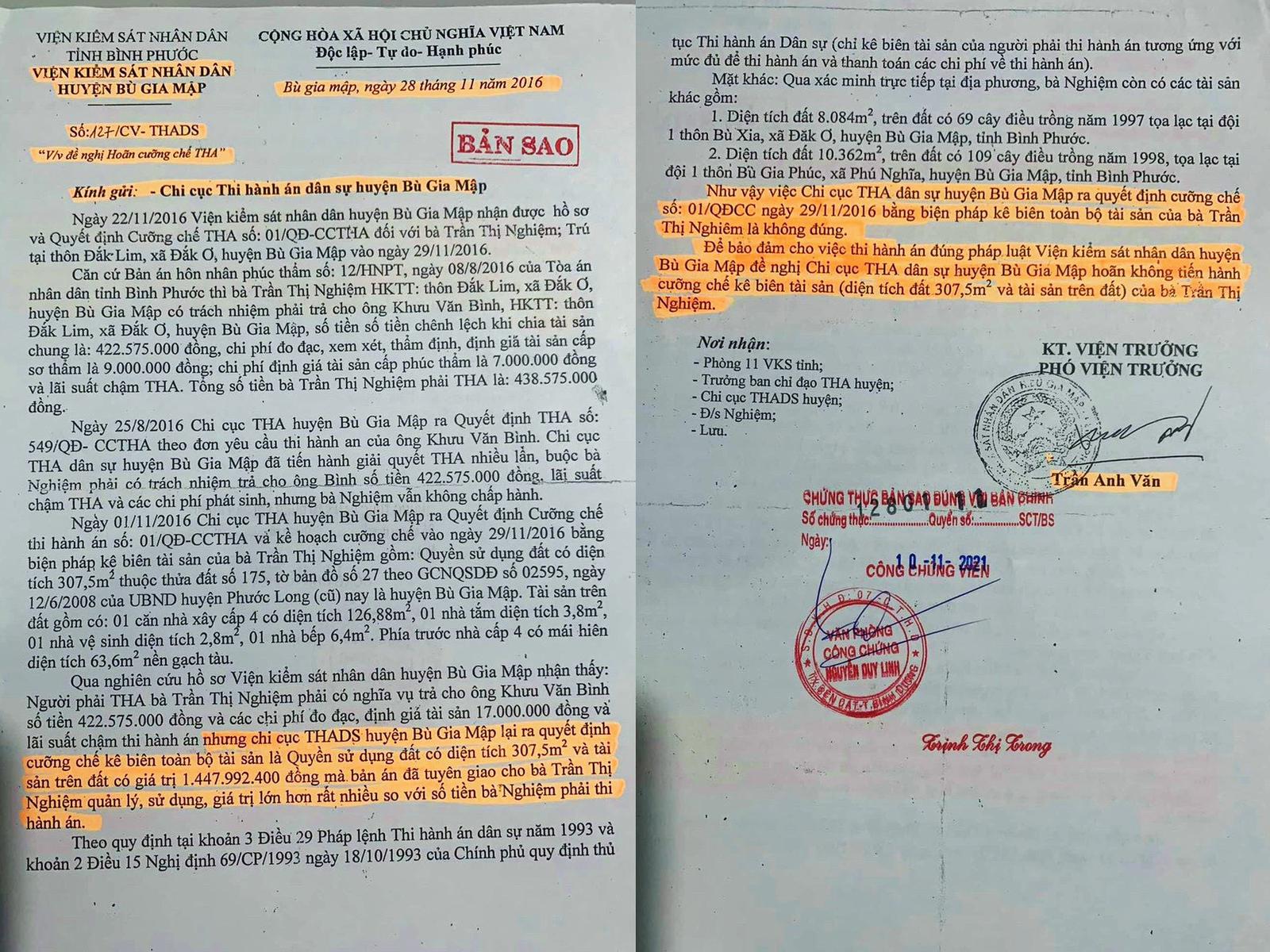 Đến ngày 28/11/2016, Viện KSND huyện Bù Gia Mập ban hành Công văn số 127/CV-THADS về việc hoãn cưỡng chế thi hành án, đề nghị không tiến hành cưỡng chế kê biên toàn bộ tài sản (diện tích đất 307,5m2 và tài sản trên đất). Tuy nhiên, Chi cục THA huyện Bù Gia Mập cố tình phớt lờ công văn trên để lấy toàn bộ tài sản của bà Nghiệm bán đấu giá.