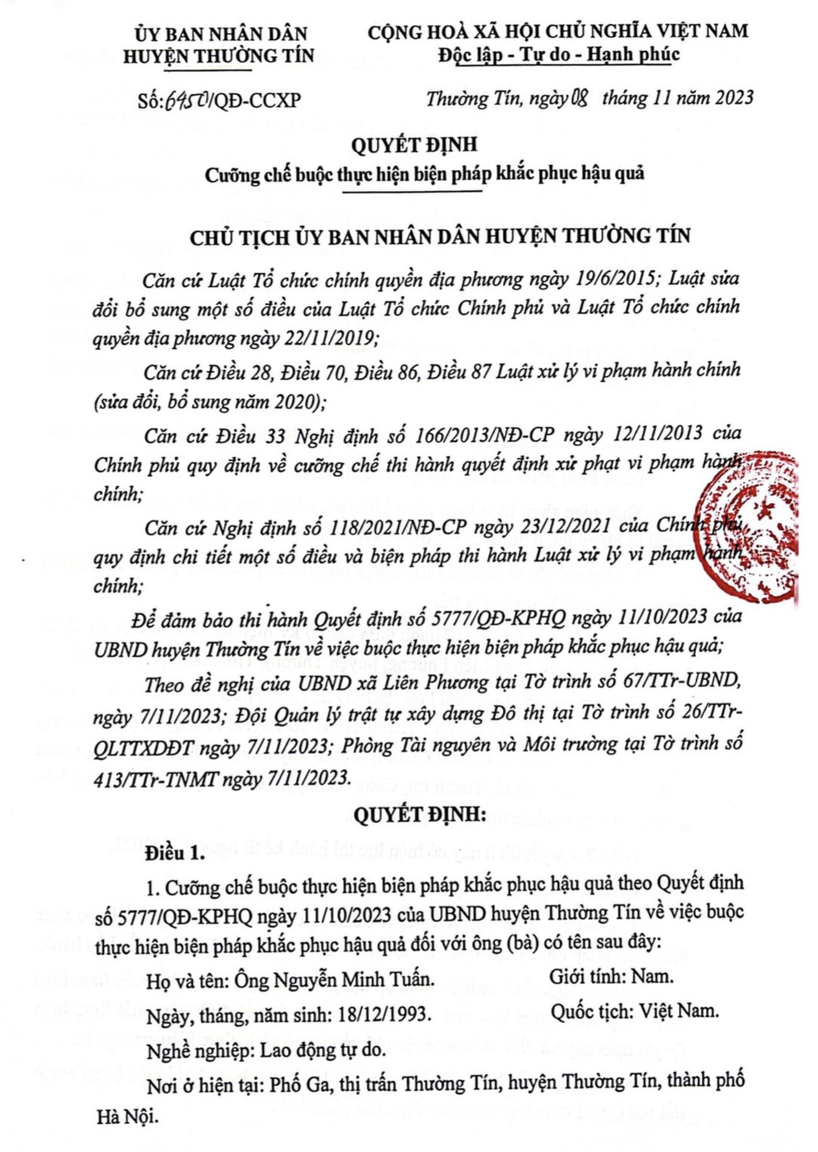 Theo Quyết định số 6450/QĐ-CCXP ngày 8/11/2023 của UBND huyện Thường Tín, huyện sẽ tổ chức cưỡng chế buộc thực hiện biện pháp khắc phục hậu quả theo Quyết định số 5777/QĐ-KPHQ ngày 11/10/2023 về việc buộc thực hiện biện pháp khắc phục hậu quả đối với ông Nguyễn Minh Tuấn, nơi ở hiện tại Phố Ga, thị trấn Thường Tín.