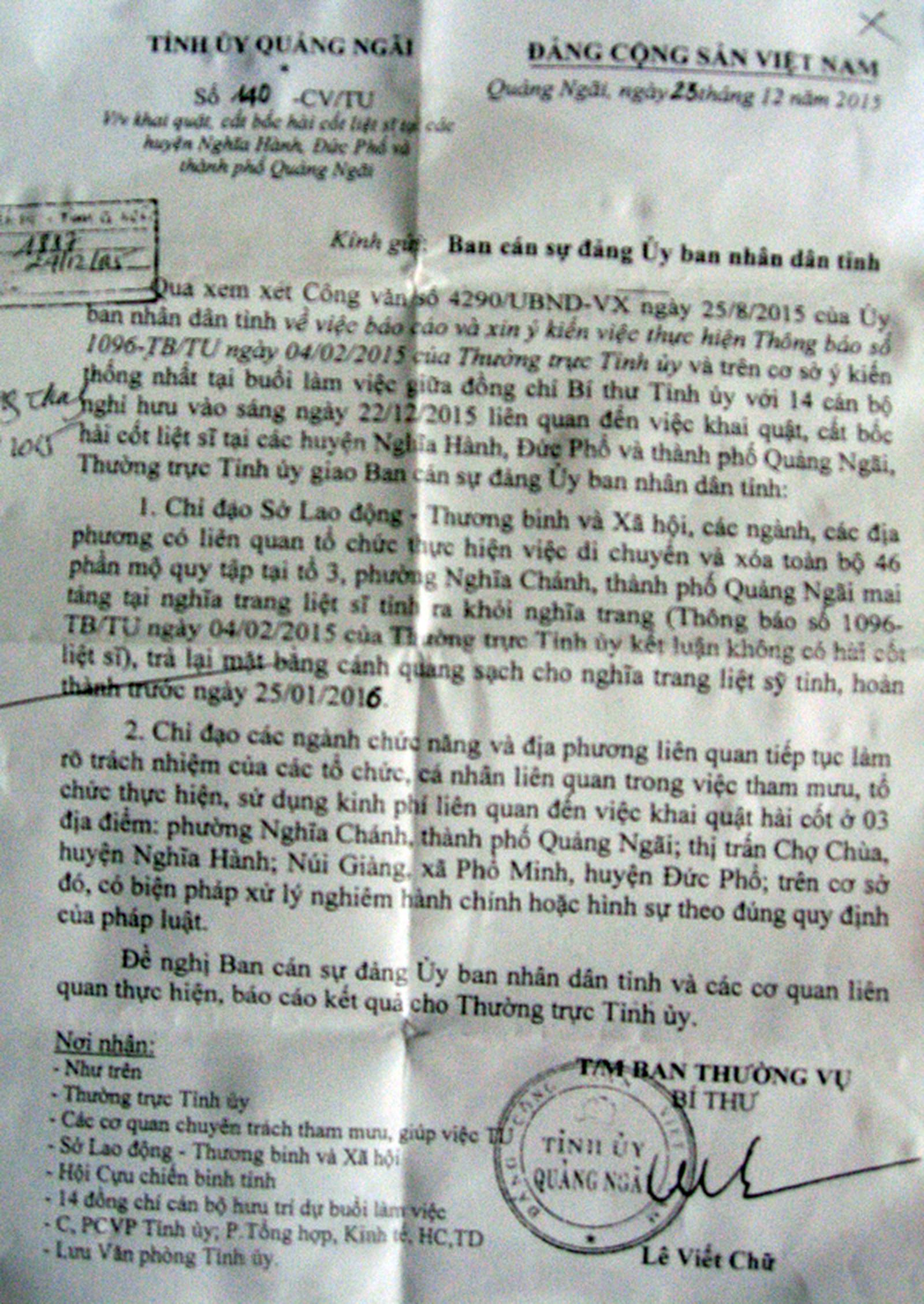 Công văn số 140 của Thường trực Tỉnh uỷ yêu cầu di chuyển và xoá toàn bộ 46 phần mộ LS giả quy tập tại Nghĩa Chánh trước ngày 25/1/2016. Ảnh: Ngọc Phó