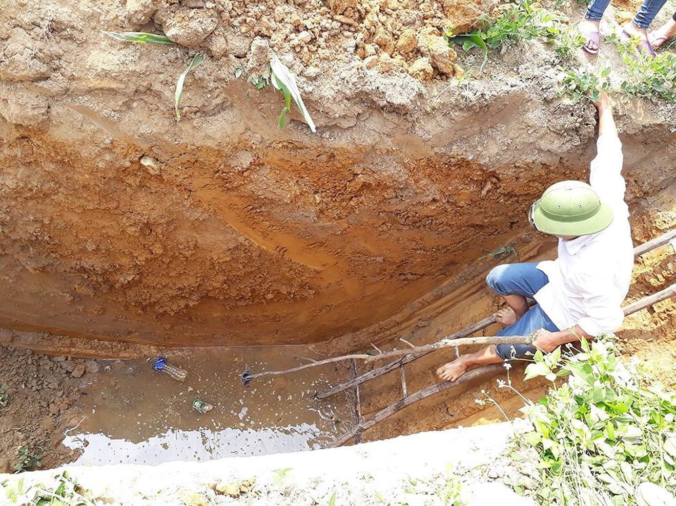 Người dân ở thôn Tân Phúc, xã Hương Trạch khi đào hố đất sâu khoảng 4m phát hiện dầu rỉ ra từ mạch nước ngầm. Ảnh: HY