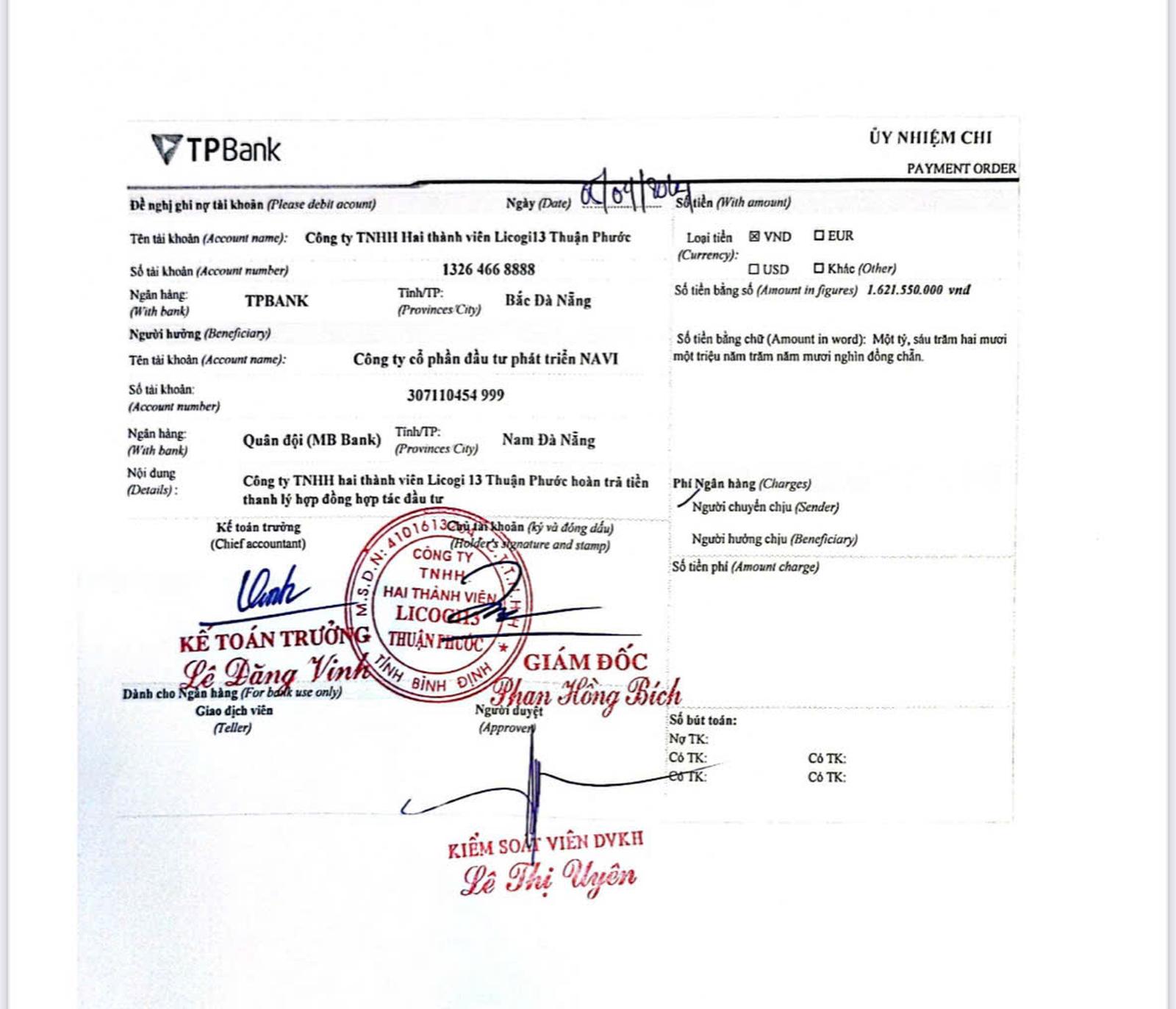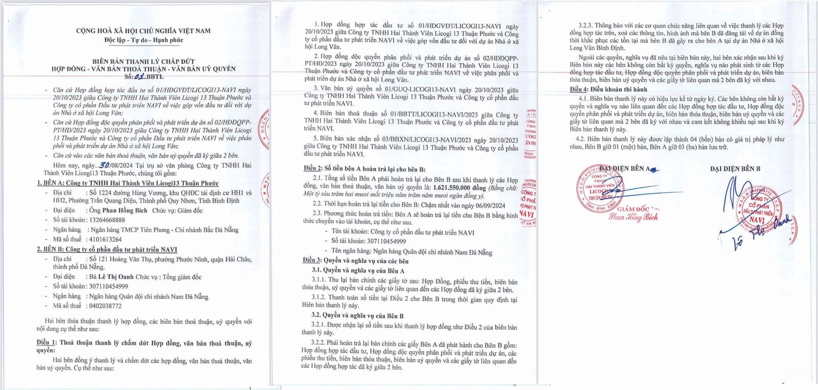 Tuy nhiên, tại buổi làm việc với Sở Xây dựng, đại diện Công ty Licogi 13 Thuận Phước đã cung cấp Biên bản số 01.BBTL ngày 30/8/2024 về thanh lý chấm dứt Hợp đồng - Văn bản thoả thuận - Văn bản uỷ quyền giữa Công ty Licogi 13 Thuận Phước và Công ty Navi.