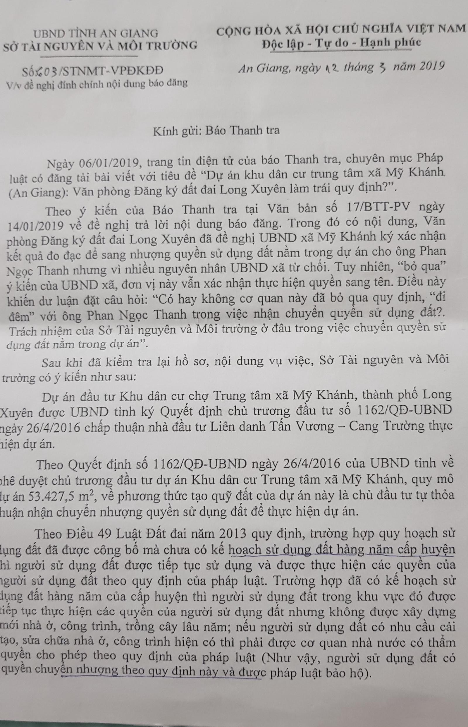 Những tưởng sau khi Báo Thanh tra và một số cơ quan báo chí khác lên tiếng về hành vi lập khống, giả mạo hồ sơ để làm căn cứ chuyển quyền sử dụng đất của dự án Khu dân cư trung tâm xã Mỹ Khánh cho ông Phan Ngọc Thanh thì sự việc đã có hồi kết. Vậy nhưng, ngày 12/3/2019, lãnh đạo Sở TN&MT An Giang, ông Nguyễn Trọng Thành, Phó Giám đốc Sở ký Văn bản số 603/STNMT-VPĐKĐĐ gửi các cơ quan báo chí khẳng định Văn phòng ĐKĐĐ Chi nhánh Long Xuyên làm đúng quy định.
