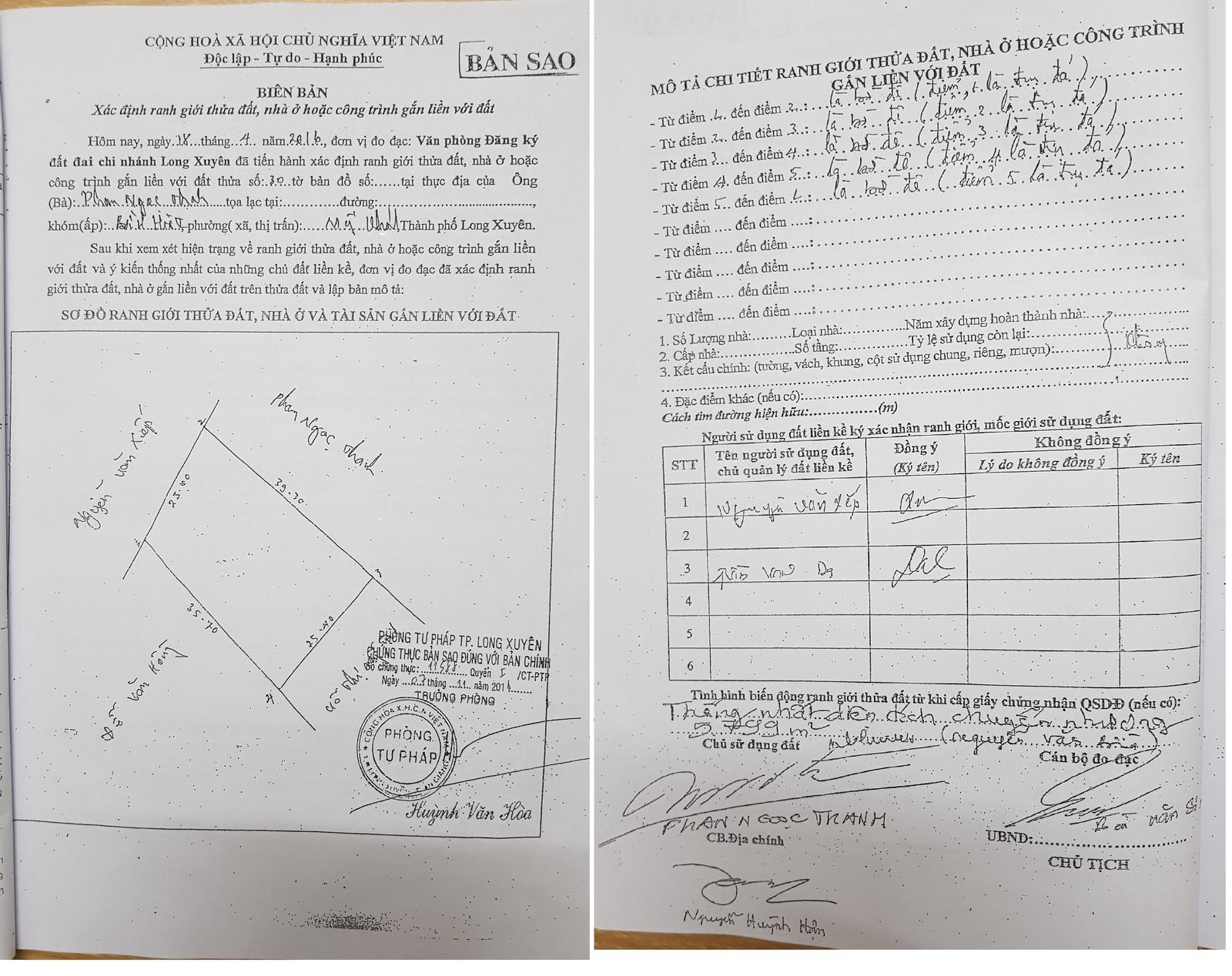 Điều này không đúng bởi ngày 18/4/2014, biên bản xác định ranh giới, mốc giới thửa đất do đơn vị này lập là giả mạo. Cán bộ của Văn phòng ĐKĐĐ Chi nhánh Long Xuyên là Bùi Văn Sinh và cán bộ địa chính xã Mỹ Khánh Nguyễn Huỳnh Hận không trực tiếp xuống đo đạc mà vẫn ký biên bản. Các hộ dân có đất trong dự án khẳng định như vậy, đồng thời trao đổi trực tiếp với phóng viên có sự chứng kiến của Bí thư, Chủ tịch xã Mỹ Khánh, ông Liêu Quốc Bình; ông Nguyễn Huỳnh Hận có thừa nhận sai phạm.