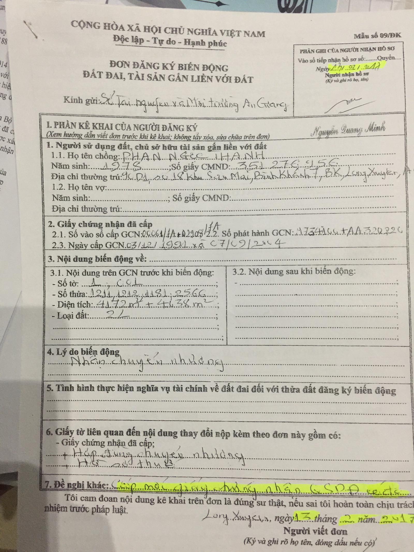 Tuy nhiên, trong đơn đăng ký biến động đất đai gửi Sở TN&MT An Giang đề ngày 13/2 có chữ ký nhận của cán bộ tên Nguyễn Quang Minh, ông Thanh đã đề nghị có đo đạc và bỏ trống việc ý kiến xác nhận đồng ý từ xã và TP.