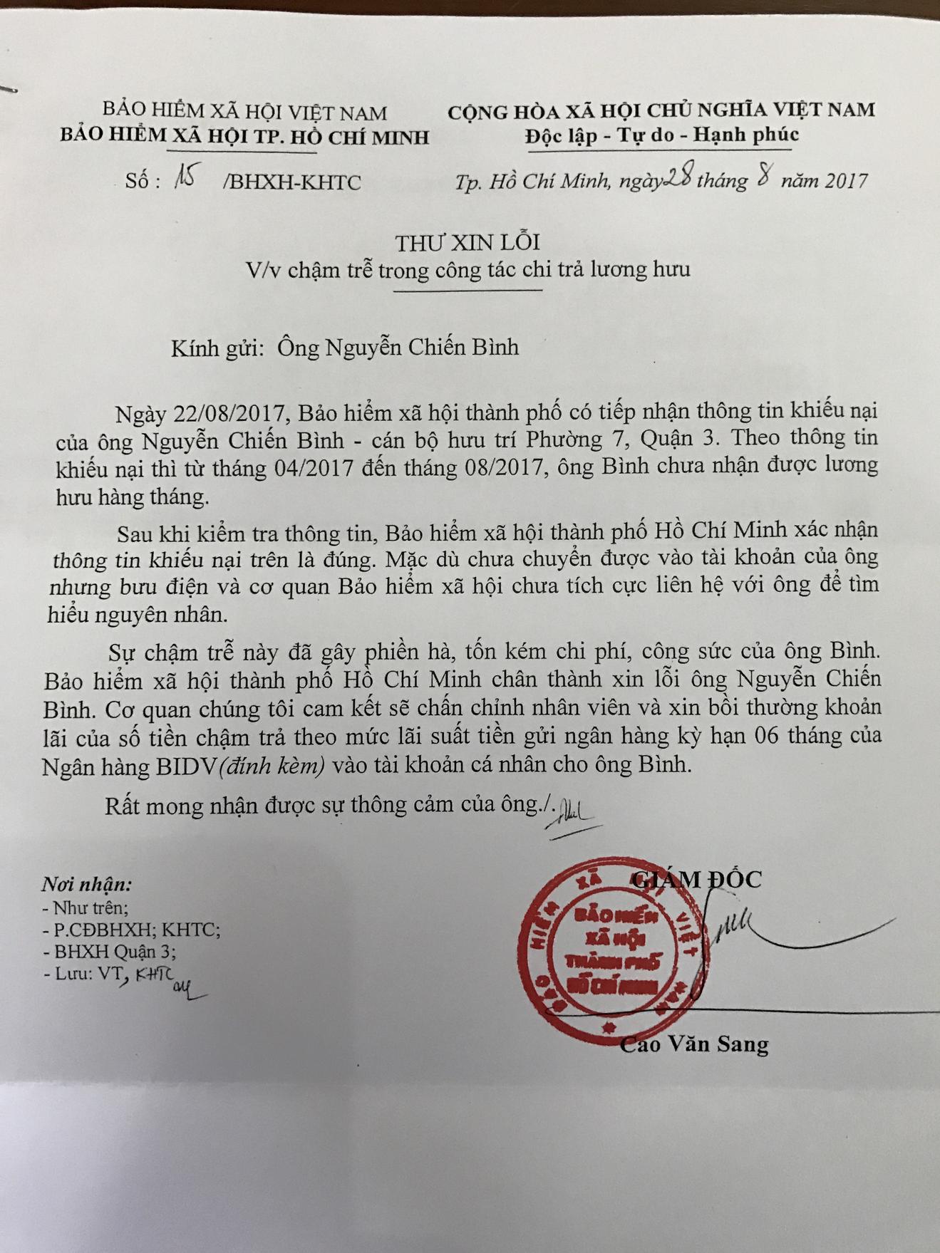 (Thanh tra) - Liên quan đến sự việc nguyên Phó Tổng Thanh tra Chính phủ Nguyễn Chiến Bình 5 tháng không được nhận lương hưu qua tài khoản, ngày 28/8/2017, ông Cao Văn Sang, Giám đốc Bảo hiểm Xã hội (BHXH) TP Hồ Chí Minh đã ký thư xin lỗi và xin bồi thường lãi suất số tiền chậm trả.