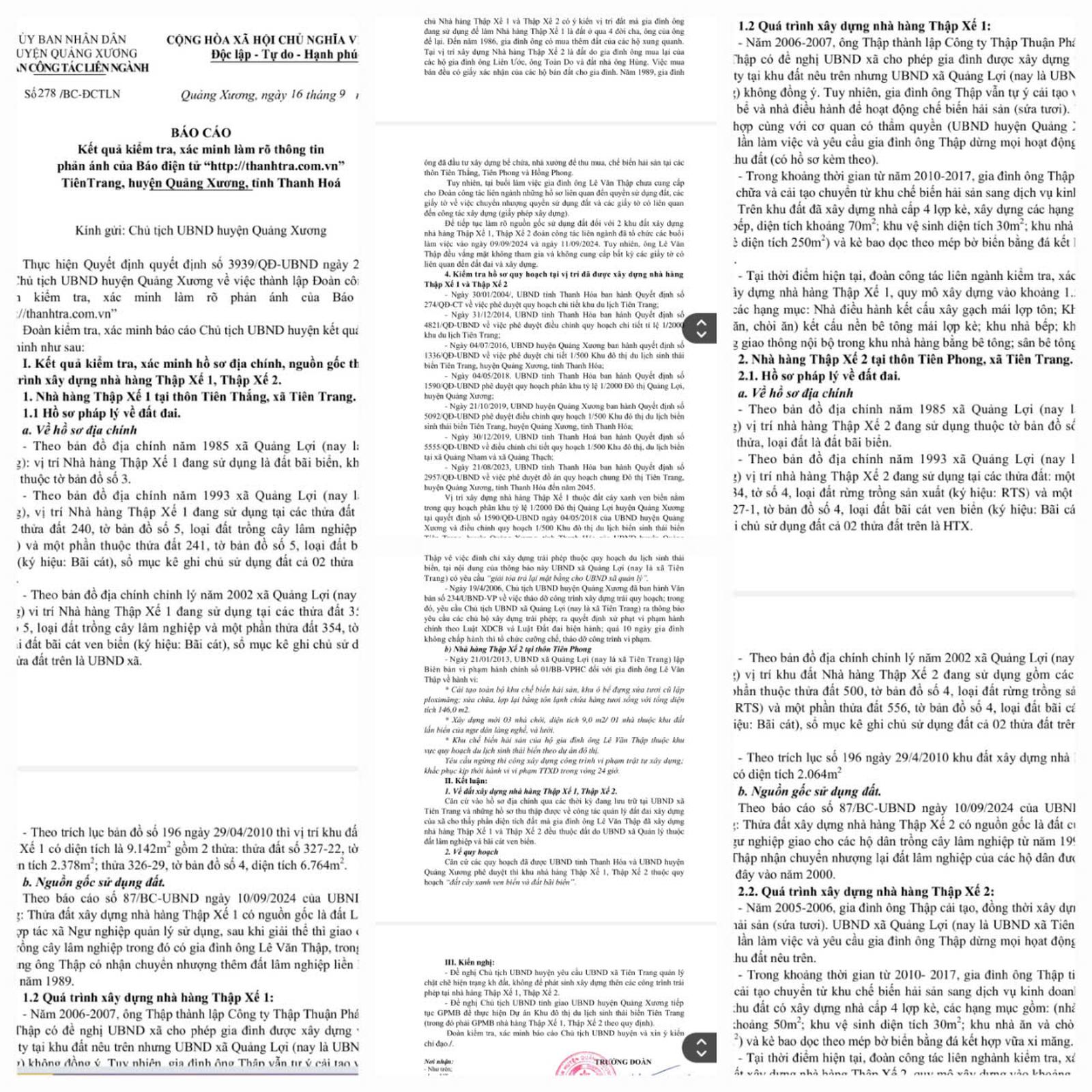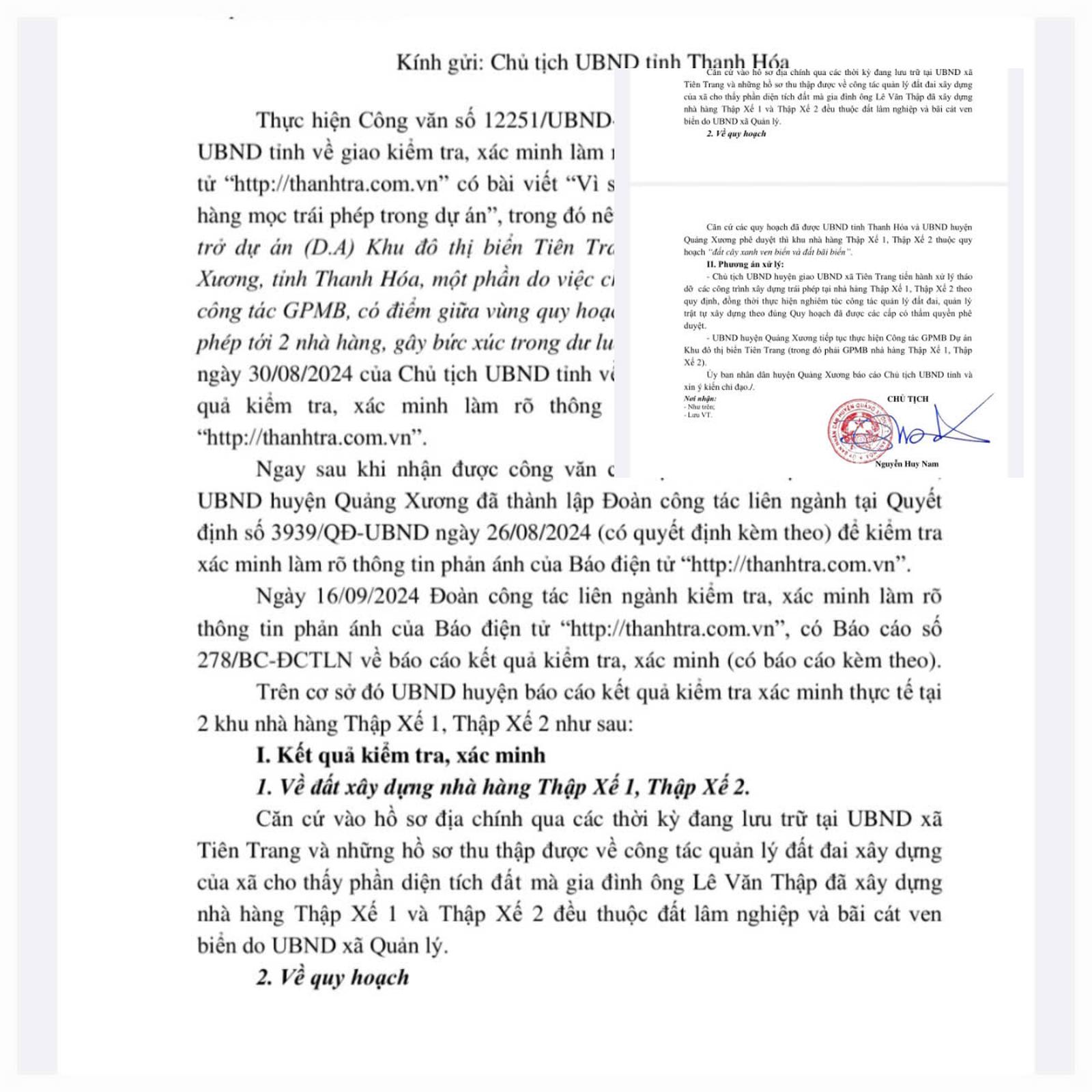 Ngày 16/9/2024, ông Nguyễn Huy Nam, Chủ tịch UBND huyện Quảng Xương đã có Văn bản 3541/UBND-TNMT báo cáo Chủ tịch UBND tỉnh Thanh Hóa kết quả xác minh nội dung Báo Thanh tra phản ánh về việc xây dựng trái phép Nhà hàng Thập Xế 1 và Thập Xế 2 nhưng chưa bị tháo dỡ, cưỡng chế theo quy định.