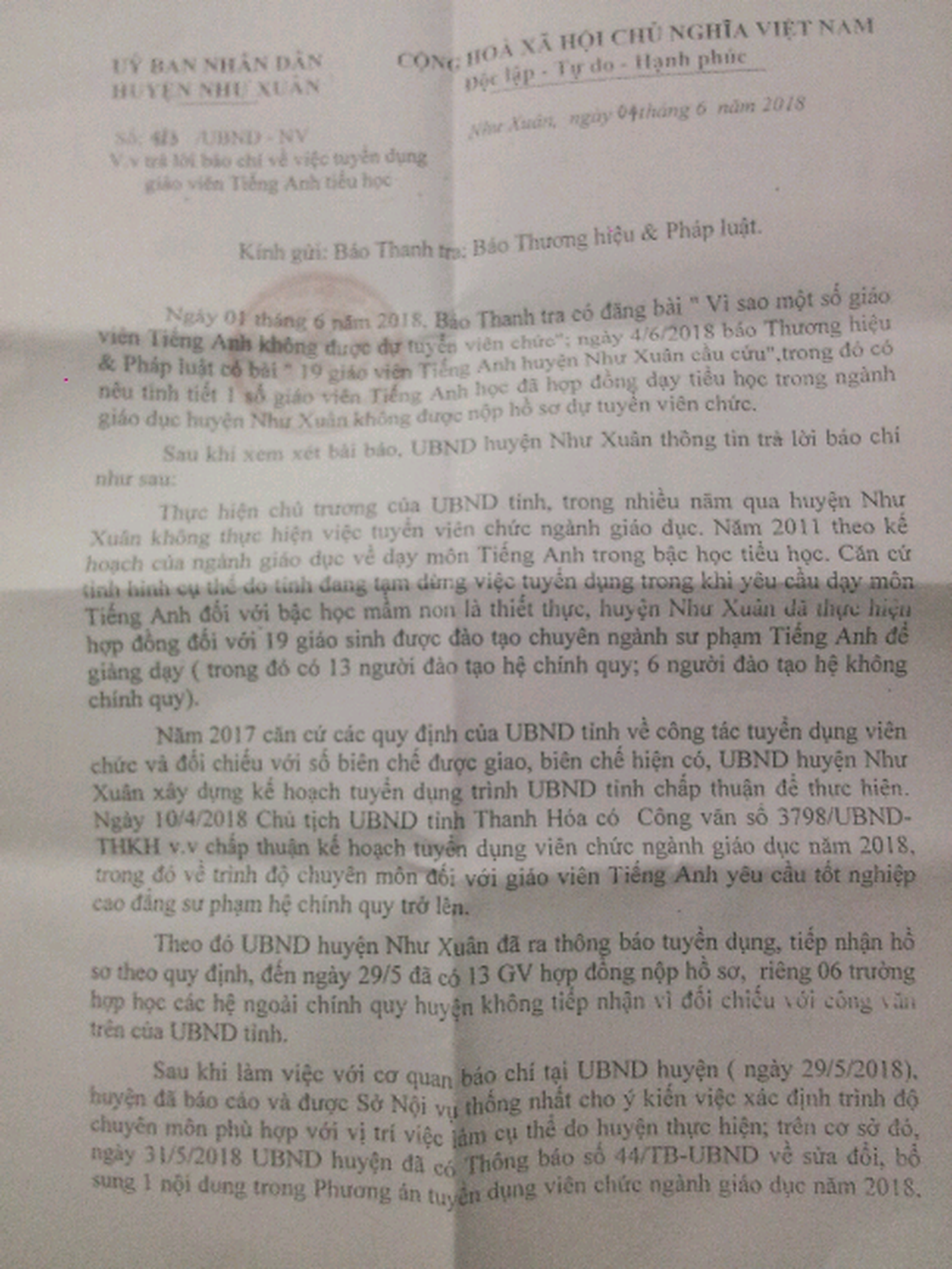 Sau khi Báo đăng, ngày 4/6/2018 ông Nguyễn Văn Phương, Phó Chủ tịch UBND huyện Như Xuân đã có Văn bản số 483/UBND-NV về trả lời nội dung Báo Thanh tra nêu, trong đó nêu: Thực hiện chủ trương của UBND tỉnh trong nhiều năm qua, huyện Như Xuân không thực hiện tuyển viên chức ngành Giáo dục. Năm 2011, theo kế hoạch của ngành Giáo dục về bộ môn Tiếng Anh bậc tiểu học, căn cứ tình hình cụ thể, do tỉnh đang tạm dừng việc tuyển dụng trong khi yêu cầu dạy môn Tiếng Anh đối với học sinh tiểu học là thiết thực. Huyện Như Xuân đã thực hiện hợp đồng với 19 giáo viên được đào tạo chuyên ngành Sư phạm Tiếng Anh để giảng dạy (trong đó có 13 người được đào tạo hệ chính quy, 6 người được đào tạo không chính quy).