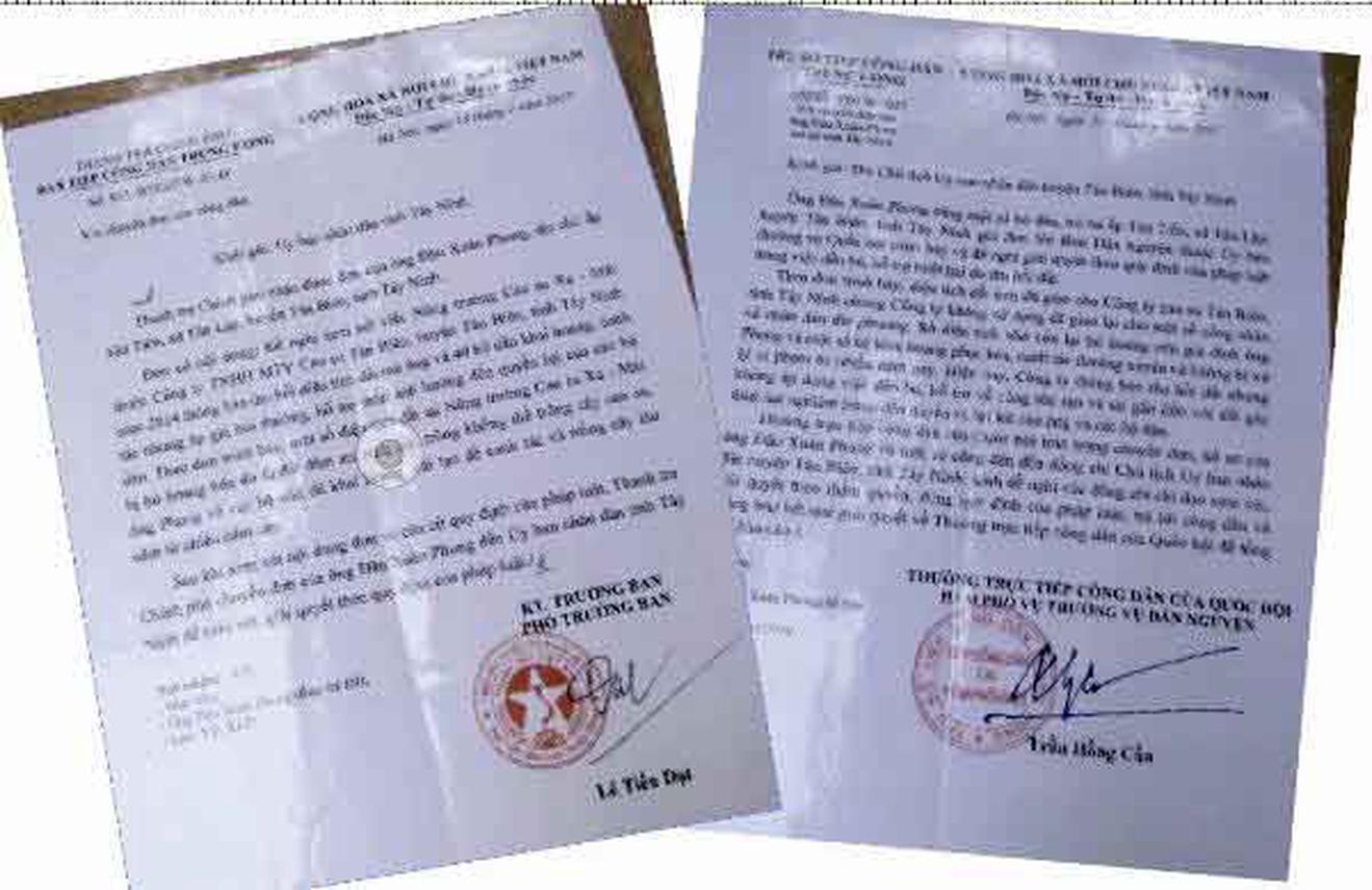 Trước đó, ngày 12/4/2017, hàm Phó Vụ trưởng Vụ Dân nguyện Trần Hồng Cẩn cũng có văn bản gửi Chủ tịch UBND huyện Tân Biên nêu rõ: Theo đơn trình bày của ông Đậu Xuân Phong cùng một số hộ dân trú tại ấp Tân Tiến gửi Ban Dân nguyện thuộc Ủy ban Thường vụ Quốc hội trình bày và đề nghị giải quyết theo quy định của pháp luật trong việc đền bù, hỗ trợ thiệt hại do thu hồi đất, “diện tích đất trên đã giao cho Công ty Cao su Tân Biên, tỉnh Tây Ninh, nhưng công ty không sử dụng đã giao lại cho một số công nhân và nhân dân địa phương. Số diện tích nhỏ còn lại bỏ hoang nên gia đình ông Phong và một số hộ khai hoang, phục hóa, canh tác thường xuyên và không bị xử lý vi phạm từ nhiều năm nay. Hiện nay, công ty thông báo thu hồi đất nhưng không áp dụng việc đền bù, hỗ trợ về công tôn tạo và tài sản gắn liền với đất gây thiệt hại nghiêm trọng đến quyền và lợi ích của ông và các hộ dân”.
