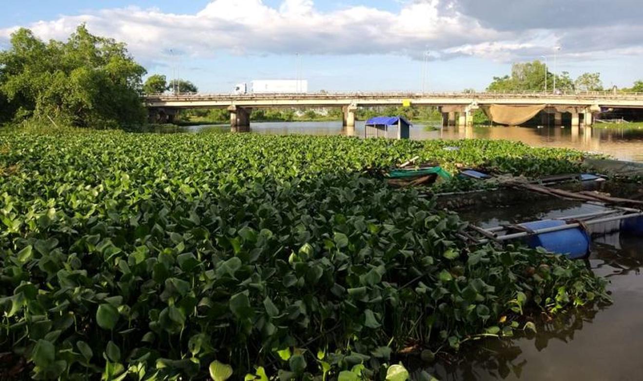 Một khúc sông Nghèn (đoạn qua thị trấn Nghèn, huyện Can Lộc, Hà Tĩnh) bị bèo tây quấn chặt, gây ô nhiễm nghiêm trọng. Ảnh: Nguyên Dũng