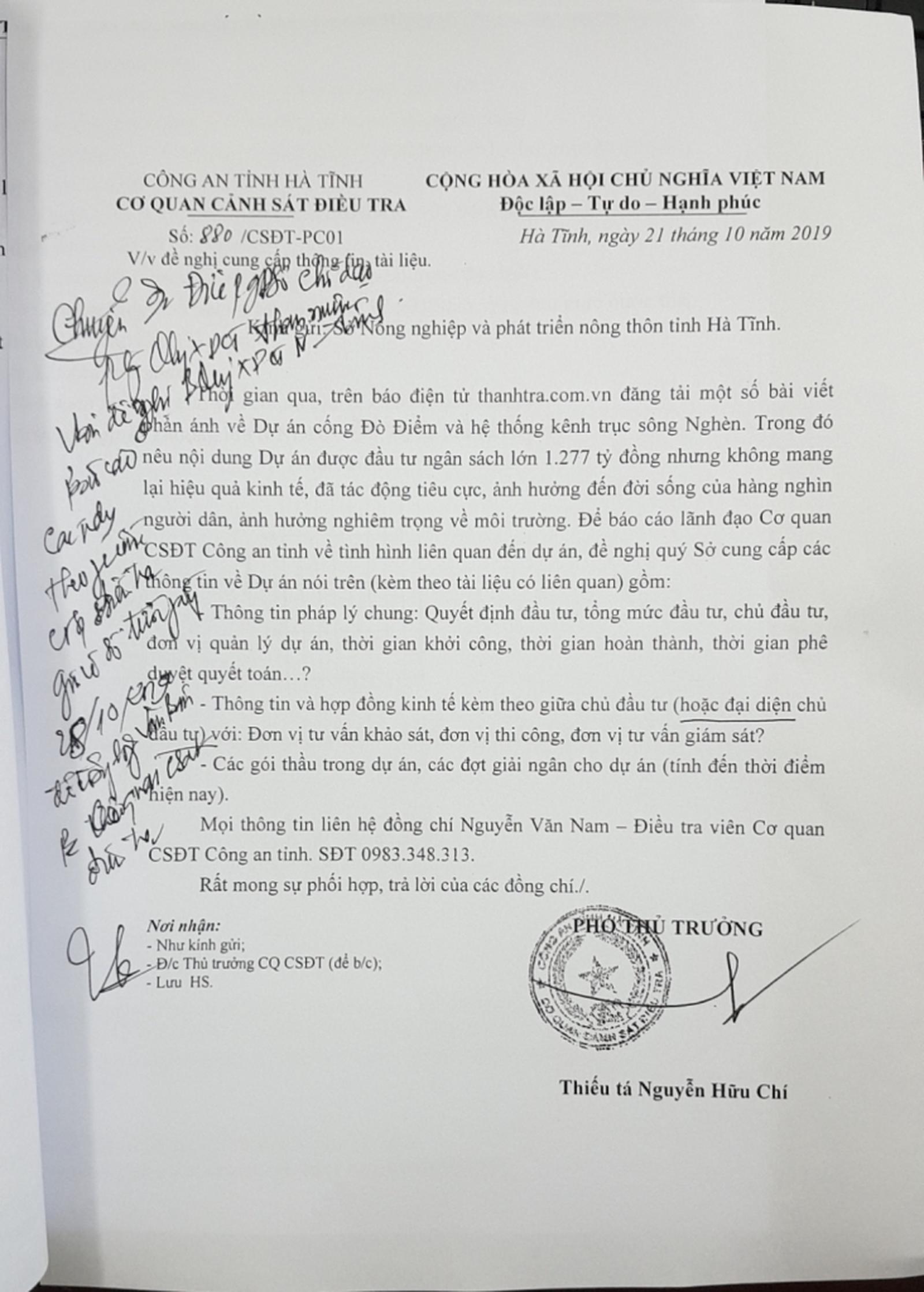 Ngày 21/10/2019 Cơ quan Cảnh sát điều tra (CSĐT) Công an tỉnh Hà Tĩnh đã có Văn bản số 880/CSĐT - PC01, gửi Sở NN&PTNT Hà Tĩnh với nội dung: Thời gian qua, Báo Thanh tra đăng tải nhiều bài viết về dự án cống Đò Điểm và hệ thống kênh trục sông Nghèn. Trong đó nêu nội dung dự án được đầu tư ngân sách lớn 1.277 tỷ đồng nhưng không mang lại hiệu quả kinh tế lớn và ngược lại còn tác động tiêu cực, ảnh hưởng đến đời sống của hàng ngàn người dân địa phương, ảnh hưởng nghiêm trọng về môi trường.