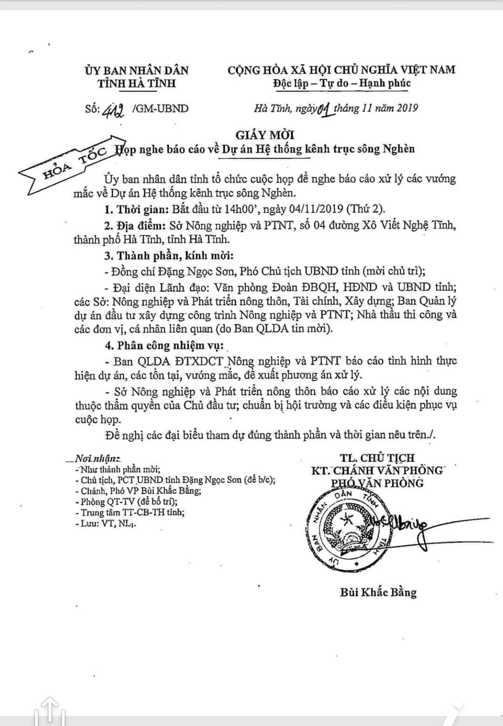 Tại một diễn biến có liên quan, ngày 1/11, UBND tỉnh Hà Tĩnh cũng đã có Công văn hỏa tốc số 412/GM - UBND, gửi Sở NN&;PTNT Hà Tĩnh, các cơ quan chức năng, triệu tập cuộc họp lúc 14 giờ ngày 4/11 dưới sự chủ trì của ông Đặng Ngọc Sơn, Phó Chủ tịch UBND tỉnh Hà Tĩnh gồm cá nhân đơn vị liên quan như Văn phòng Đoàn ĐBQH, HĐND, UBND tỉnh, Sở NN&PTNT, Sở Tài chính, Sở Xây dựng, Ban Quản lý dự án đầu tư xây dựng công trình NN&PT Nông thôn, nhà thầu thi công và các đơn vị, cá nhân liên quan nghe báo cáo về dự án kênh trục sông Nghèn.