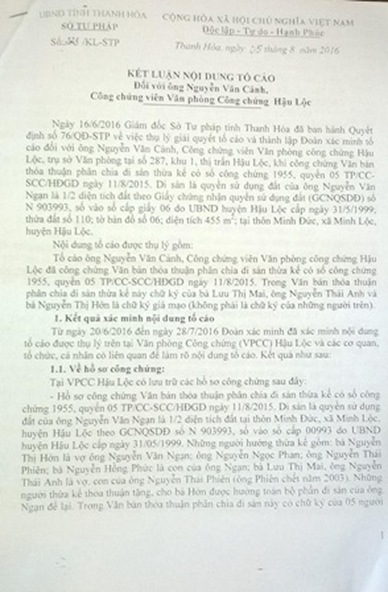 Cụ thể Kết luận có đoạn nêu: “Như vậy, nội dung tố cáo ông Nguyễn Văn Cảnh, công chứng viên Văn phòng Công chứng Hậu Lộc đã công chứng văn bản thỏa thuận phân chia di sản thừa kế có số công chứng 1955, quyển 5 TP/CC-SCC/HĐGD ngày 11/8/2015. Trong văn bản này chữ ký của bà Lưu Thị Mai và Nguyễn Thái Anh là chữ ký giả mạo là tố cáo đúng.