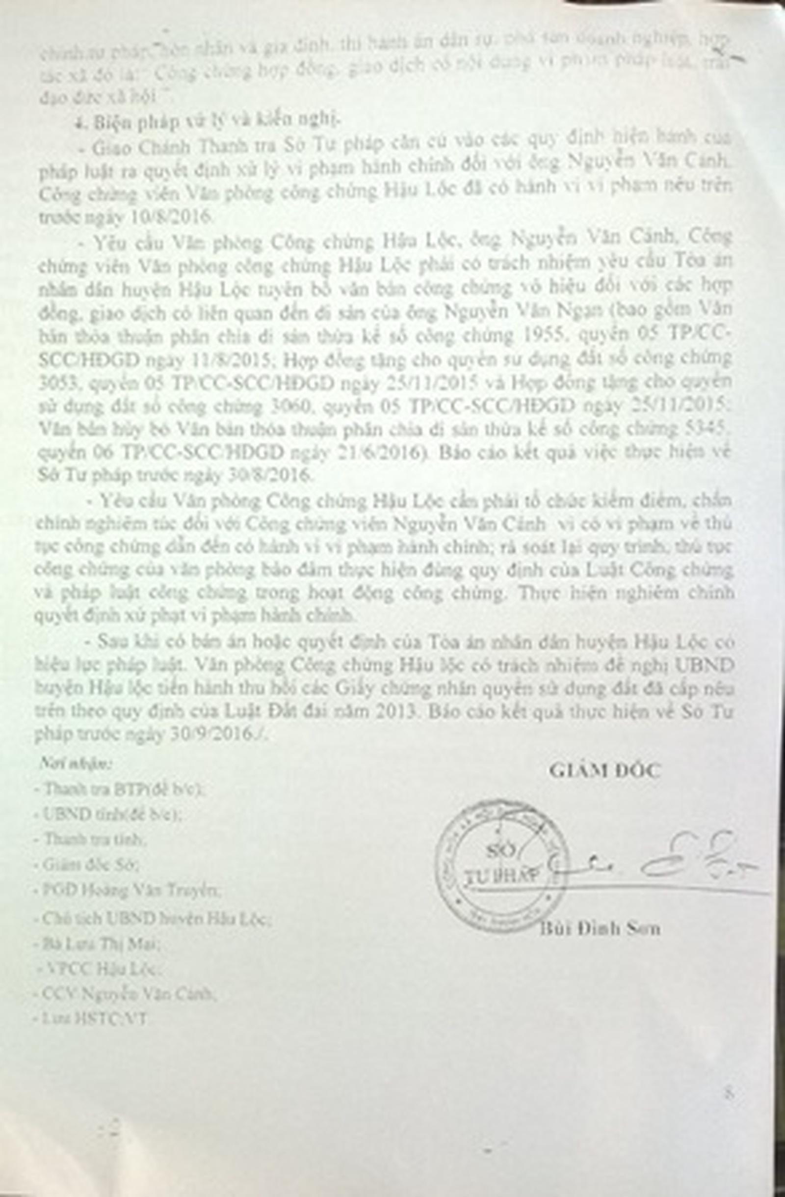 Giám đốc Sở Tư pháp cũng yêu cầu Văn phòng Công chứng Hậu Lộc, ông Nguyễn Văn Cảnh phải có trách nhiệm yêu cầu Tòa án nhân dân huyện Hậu Lộc tuyên bố văn bản công chứng vô hiệu đối với các hợp đồng, giao dịch có liên quan di sản của ông Nguyễn Văn Ngạn; đề nghị UBND huyện Hậu Lộc tiến hành thu hồi các Giấy chứng nhận quyền sử dụng đất đã cấp nêu trên theo quy định của Luật Đất đai năm 2013 và báo cáo kết quả thực hiện về Sở Tư pháp trước ngày 30/8/2016.