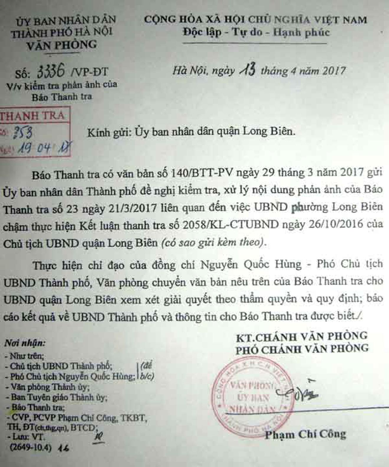 Ngày 13/4/2017, Văn phòng UBND TP Hà Nội có Văn bản số 3336/VP-ĐT về việc kiểm tra phản ánh của Báo Thanh tra, gửi UBND quận Long Biên. Văn bản nêu rõ: Thực hiện chỉ đạo của ông Nguyễn Quốc Hùng, Phó Chủ tịch UBND TP, Văn phòng chuyển văn bản nêu trên của Báo Thanh tra cho UBND quận Long Biên xem xét giải quyết theo thẩm quyền và quy định; báo cáo kết quả về UBND TP và thông tin cho Báo Thanh tra được biết.