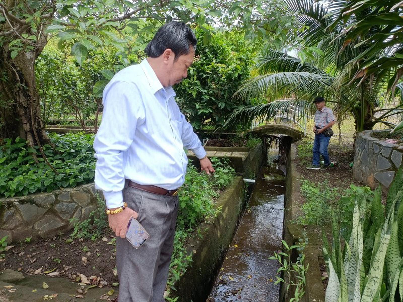 Nguồn nước ô nhiễm từ trại nuôi heo của ông Trường chảy xuống phía dưới, ảnh hưởng đến các hộ dân. Ảnh: Nguyên Dũng