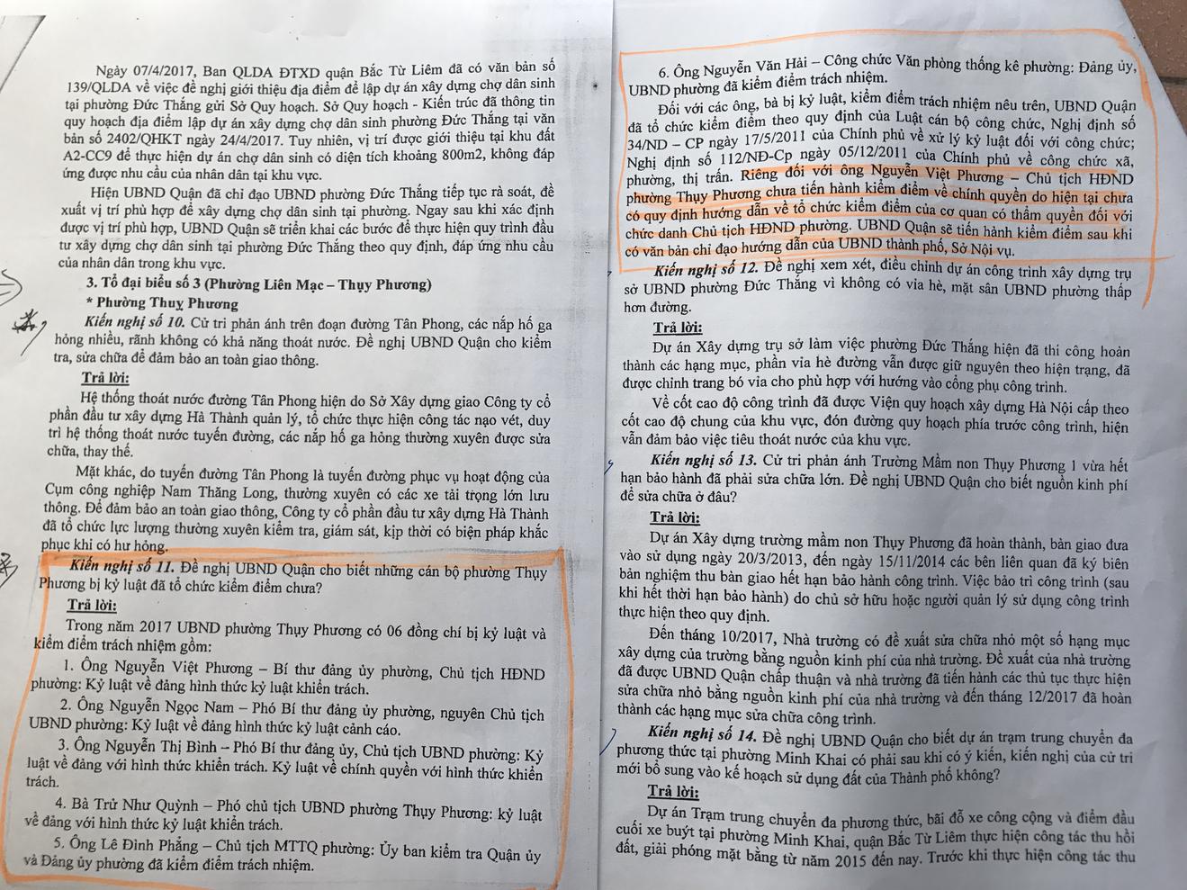 Đối với các ông, bà nêu trên, UBND quận đã tổ chức kiểm điểm theo quy định của Luật Cán bộ công chức, Nghị định số 34/NĐ-CP ngày 17/5/2011 của Chính phủ về xử lý kỷ luật đối với công chức; Nghị định số 112/NĐ-CP ngày 05/12/2011 của Chính phủ về công chức xã, phường, thị trấn.