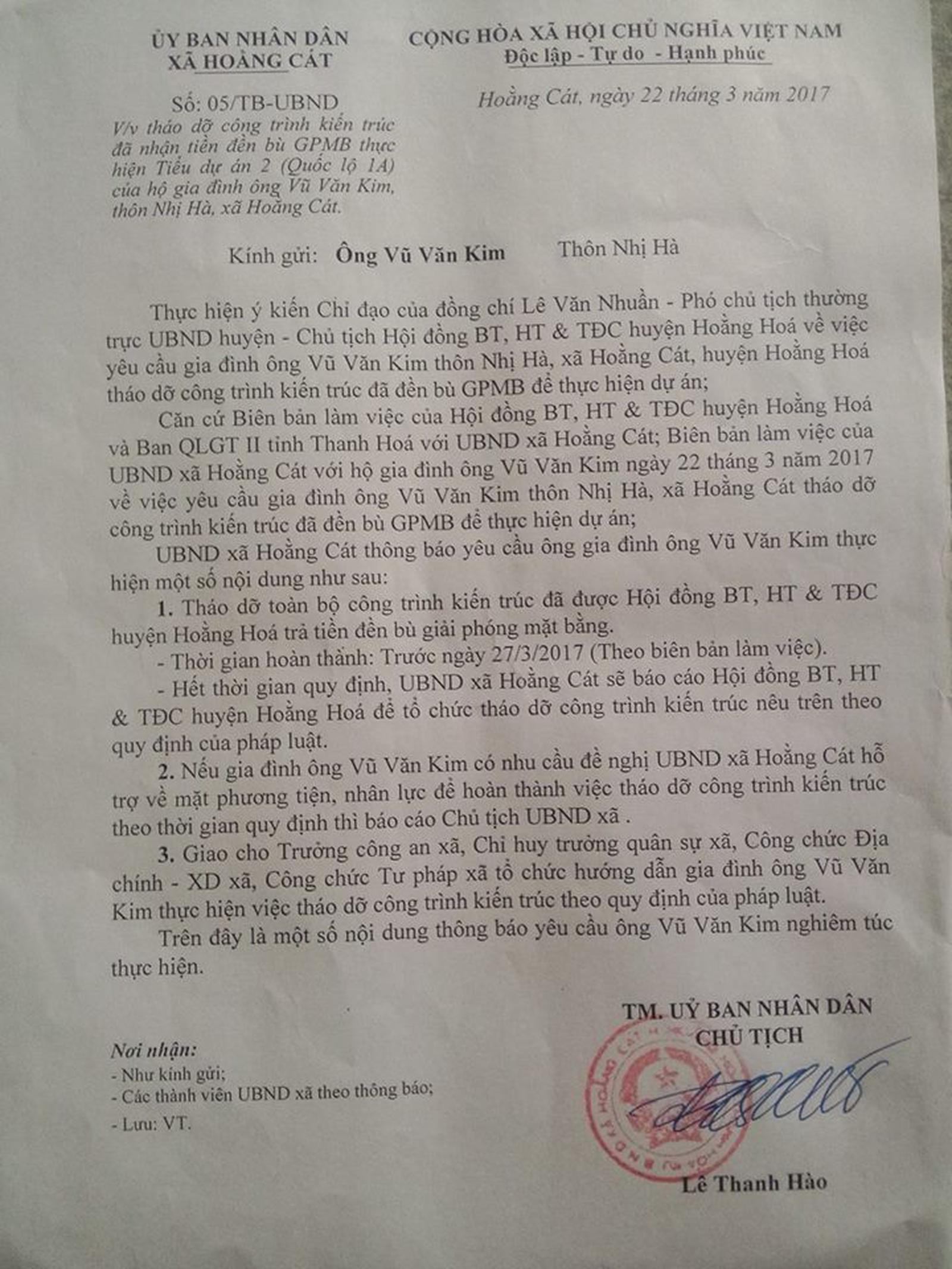 Căn cứ vào buổi làm việc, ông Lê Thanh Hào, Chủ tịch UBND xã Hoằng Cát đã ký văn bản gửi các ban ngành chức năng phối hợp, hướng dẫn, yêu cầu gia đình ông Vũ Văn Kim tổ chức tháo dỡ công trình theo đúng quy định của pháp luật xong trước ngày 27/3/2017.