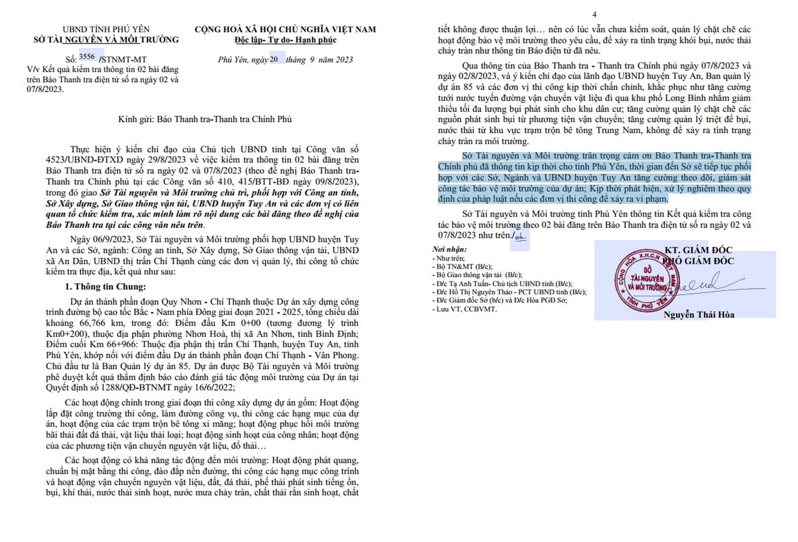 Sở TN&MT tỉnh Phú Yên đã có văn bản kiểm tra thông tin bài đăng trên Báo Thanh tra điện tử ngày 2 và 7/8/2023. Ảnh: Đình Sang