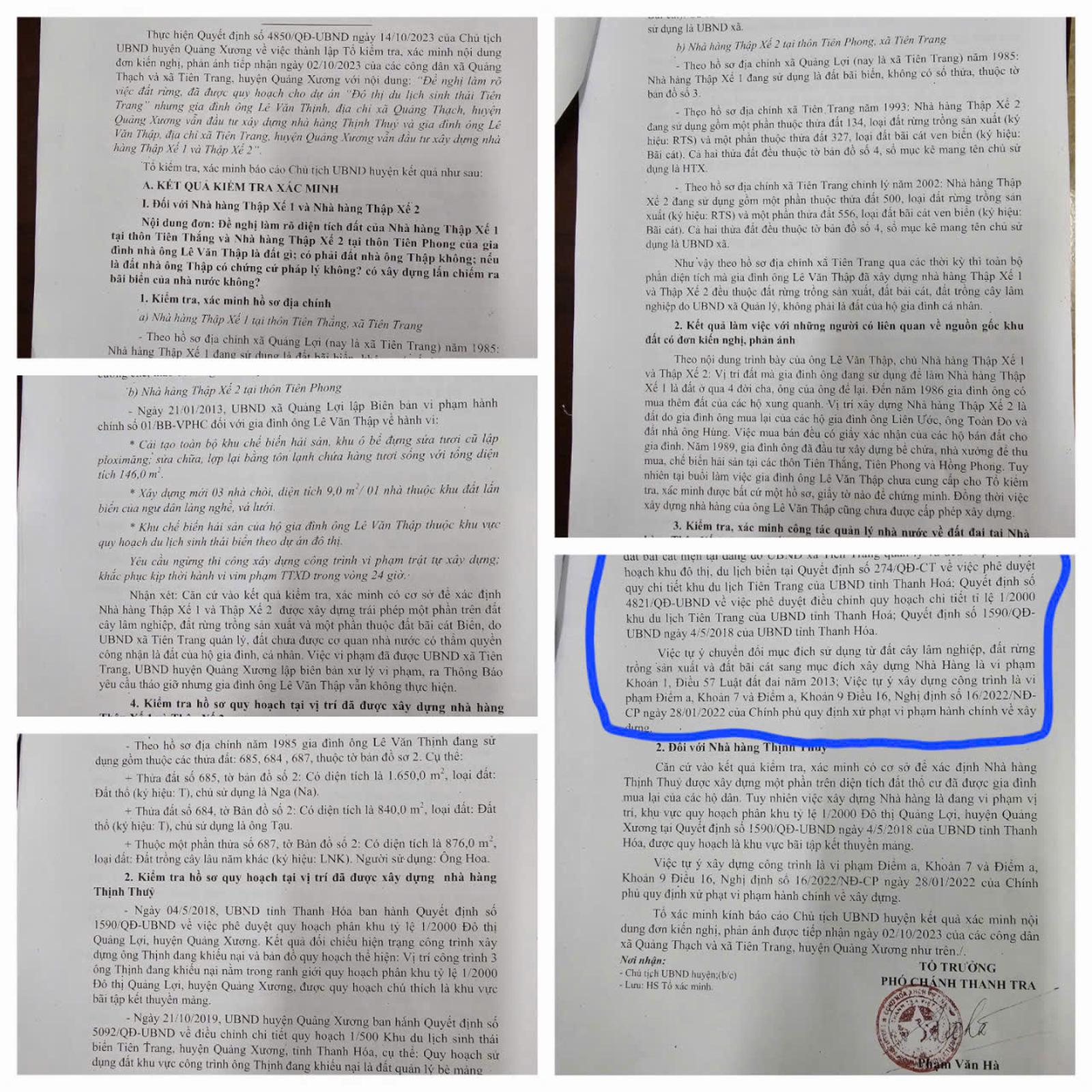 Sau khi nhận được đơn thư phản ánh của công dân, Chủ tịch UBND huyện Quảng Xương đã thành lập tổ kiểm tra, xác minh nội dung đơn kiến nghị, phản ánh này. Ngày 25/12/2023, tổ kiểm tra, xác minh của UBND huyện Quảng Xương đã có báo cáo kết quả kiểm tra, xác minh, kết luận: “Căn cứ vào kết quả xác minh có cơ sở để khẳng định cả Nhà hàng Thập Xế 1 và Thập Xế 2 đều được xây dựng trái phép trên đất cây lâm nghiệp, đất rừng trồng sản xuất và đất bãi cát hiện tại đang do UBND xã Tiên Trang quản lý và đều vi phạm quy hoạch khu đô thị, du lịch biển Tiên Trang tại Quyết định số 274/QĐ-CT về việc phê duyệt quy hoạch chi tiết Khu du lịch biển Tiên Trang của UBND tỉnh Thanh Hóa; Quyết định số 4821/QĐ-UBND về việc phê duyệt điều chỉnh quy hoạch chi tiết tỷ lệ 1/2000 Khu du lịch biển Tiên Trang của UBND tỉnh Thanh Hóa; Quyết định số 1590/QĐ-UBND ngày 4/5/2018 của UBND tinh Thanh Hóa.