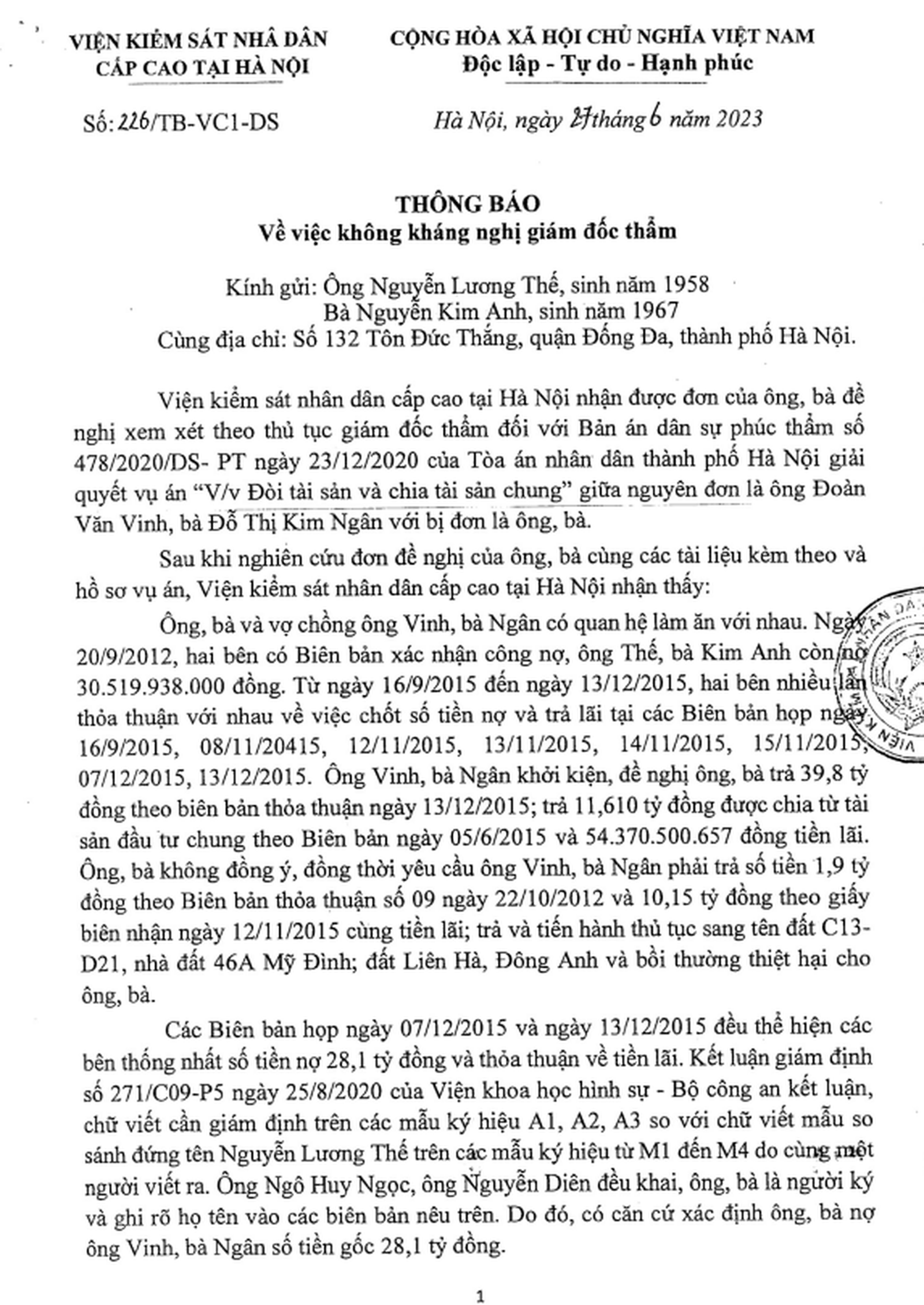 Viện Kiểm sát nhân dân Cấp cao tại Hà Nội cũng cho biết: Các biên bản họp ngày 07/12/2015 và ngày 13/12/2015 đều thể hiện các bên thống nhất số tiền nợ 28,1 tỷ đồng và thỏa thuận về tiền lãi. Kết luận giám định số 271/C09-P5 ngày 25/8/2020 của Viện Khoa học hình sự, Bộ Công an kết luận, chữ viết cần giám định trên các mẫu ký hiệu A1, A2, A3 so với chữ viết mẫu so sánh đứng tên Nguyễn Lương Thế trên các mẫu ký hiệu từ M1 đến M4 do cùng một người viết ra. Ông Ngô Huy Ngọc, ông Nguyễn Diên đều khai, ông, bà là người ký và ghi rõ họ tên vào các biên bản nêu trên. Do đó, có căn cứ xác định ông, bà nợ ông Vinh, bà Ngân số tiền gốc 28,1 tỷ đồng. Vì vậy, Viện Kiểm sát nhân dân Cấp cao tại Hà Nội quyết định không kháng nghị giám đốc thẩm đối với bản án nêu trên.