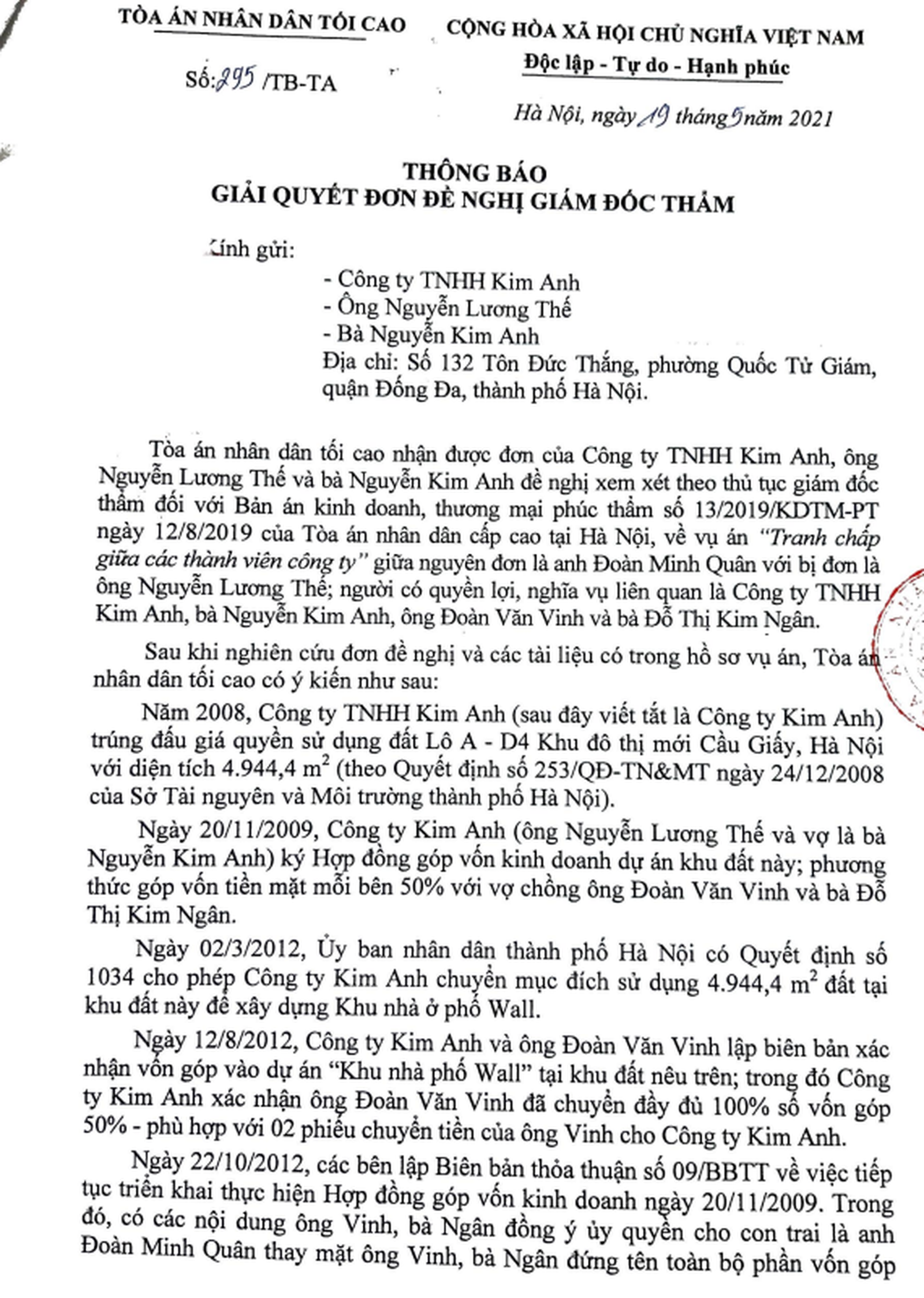 Liên quan đến vấn đề này, trước đó, ngày 19/5/2021, TAND Tối cao đã có Thông báo số 295/TB-TA, giải quyết đơn đề nghị giám đốc thẩm, thông báo đến Kim Anh, ông Nguyễn Lương Thế, bà Nguyễn Kim Anh, với nội dung: “… không có căn cứ để kháng nghị theo thủ tục giám đốc thẩm đối với Bản án kinh doanh, thương mại phúc thẩm số 13/2019/KDTN-PT…”.
