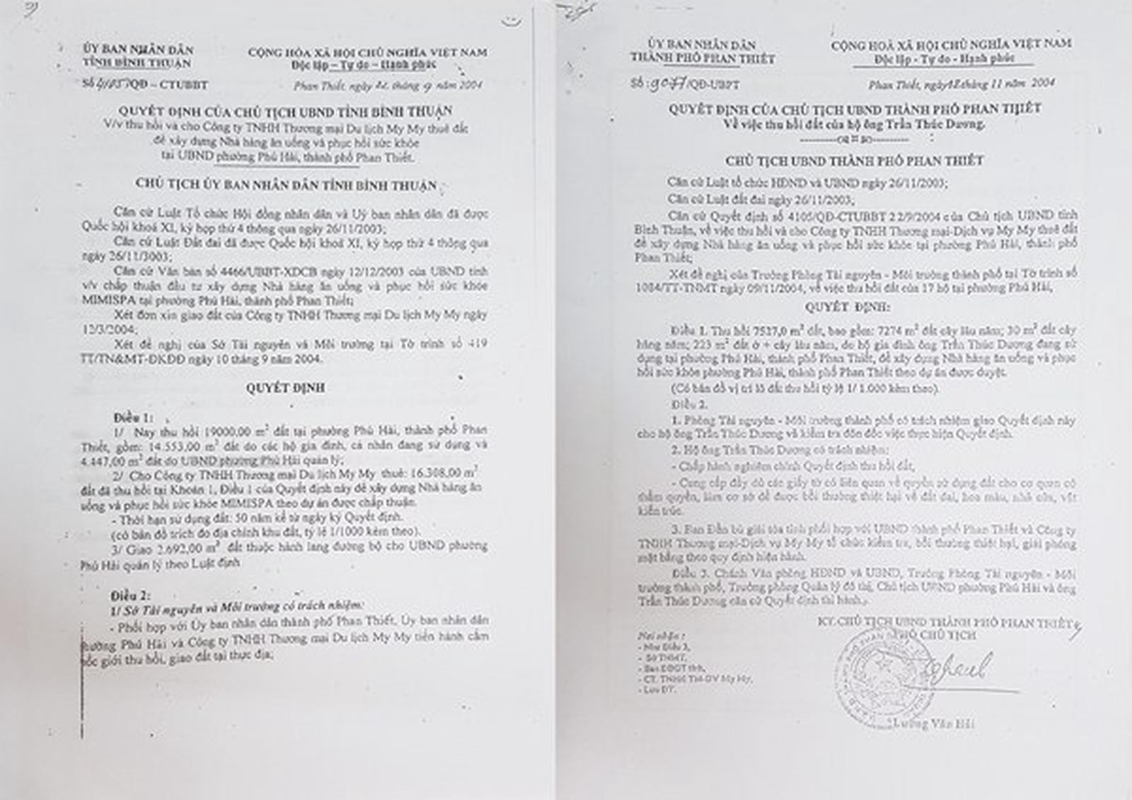 Báo Thanh tra phản hồi nội dung này như sau: Ngày 22/9/2004, Chủ tịch UBND tỉnh Bình Thuận ký ban hành Quyết định số 4105/QĐ-CTUBND về việc thu hồi đất, đồng thời cho Công ty My My thuê đất xây dựng dự án Mimi Spa. Để thực hiện dự án, UBND TP Phan Thiết đã ban hành các quyết định thu hồi đất đối với từng hộ dân.