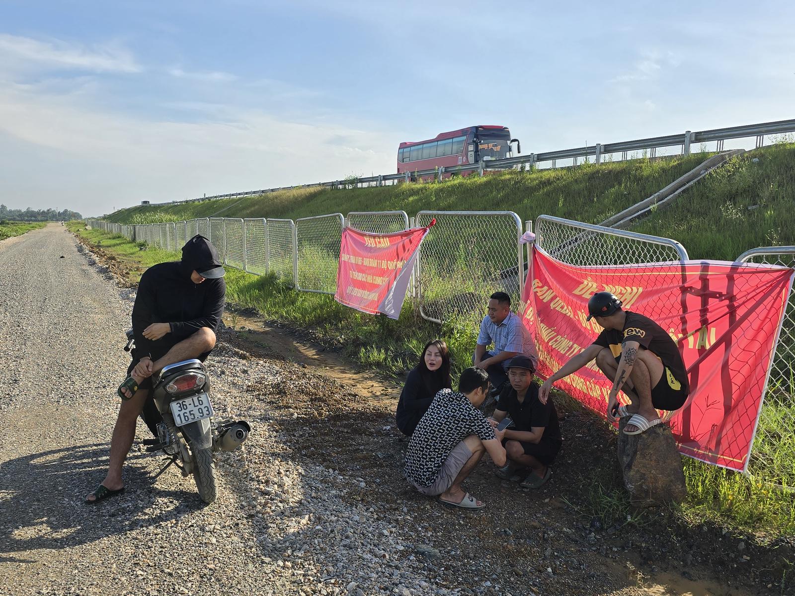 Cán bộ, công nhân một số đơn vị cung cấp nguyên vật liệu, nhân công, máy móc treo băng rôn ở đường gom cao tốc, đoạn qua xã Trung Thành, huyện Nông Cống, đòi Công ty Thành An 665 trả nợ. Ảnh: VT