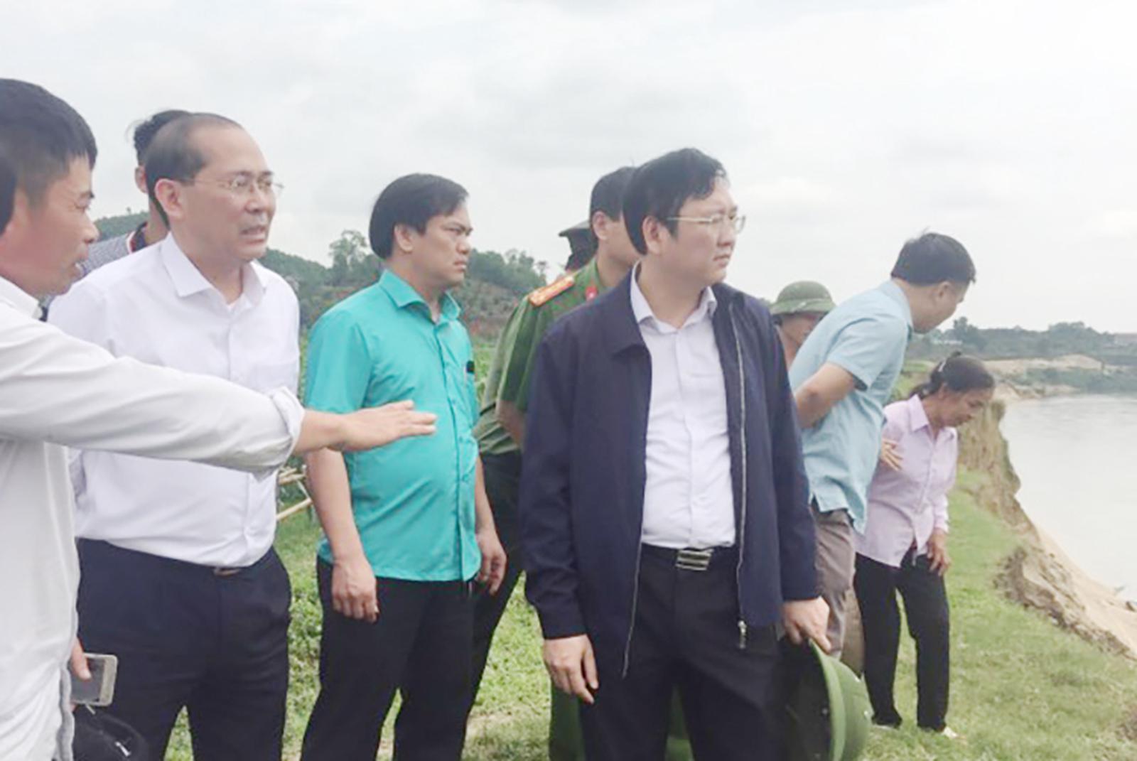 Ông Hoàng Công Thủy (thứ 2 từ trái sang) cùng nhân dân đi thị sát trực tiếp việc sạt lở đất. Ảnh: QH