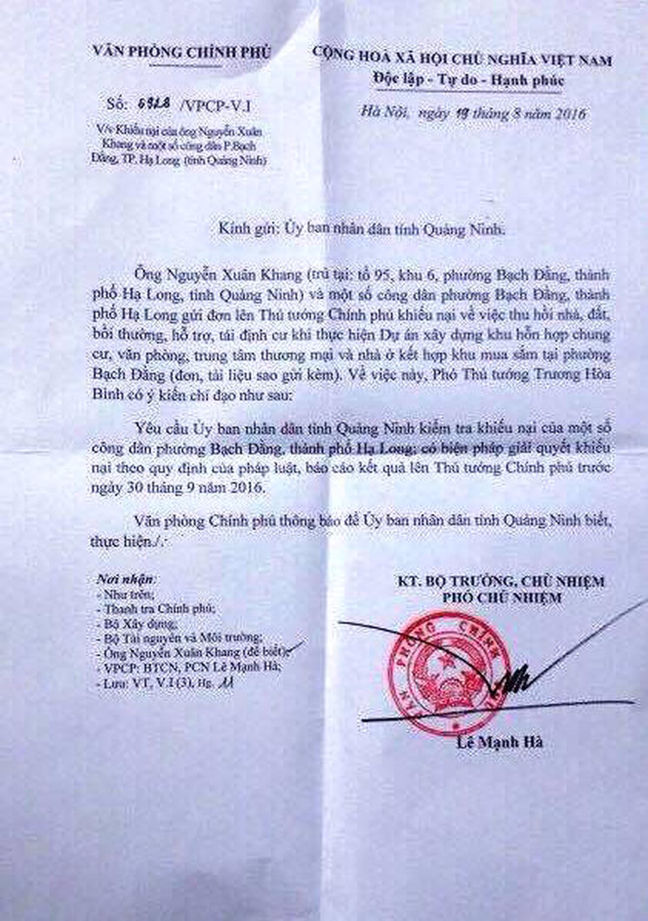 Theo Văn bản số 6928/VPCP-V.I của Văn phòng Chính phủ, ông Nguyễn Xuân Khang, trú tại tổ 95, khu 6, phường Bạch Đằng, thành phố Hạ Long cùng một số công dân khiếu nại về việc thu hồi nhà, đất, bồi thường, hỗ trợ, tái định cư khi thực hiện Dự án xây dựng khu hỗ hợp chung cư, văn phòng, trung tâm thương mại và hà ở kết hợp khu mua sắm tại phường Bạch Đằng.