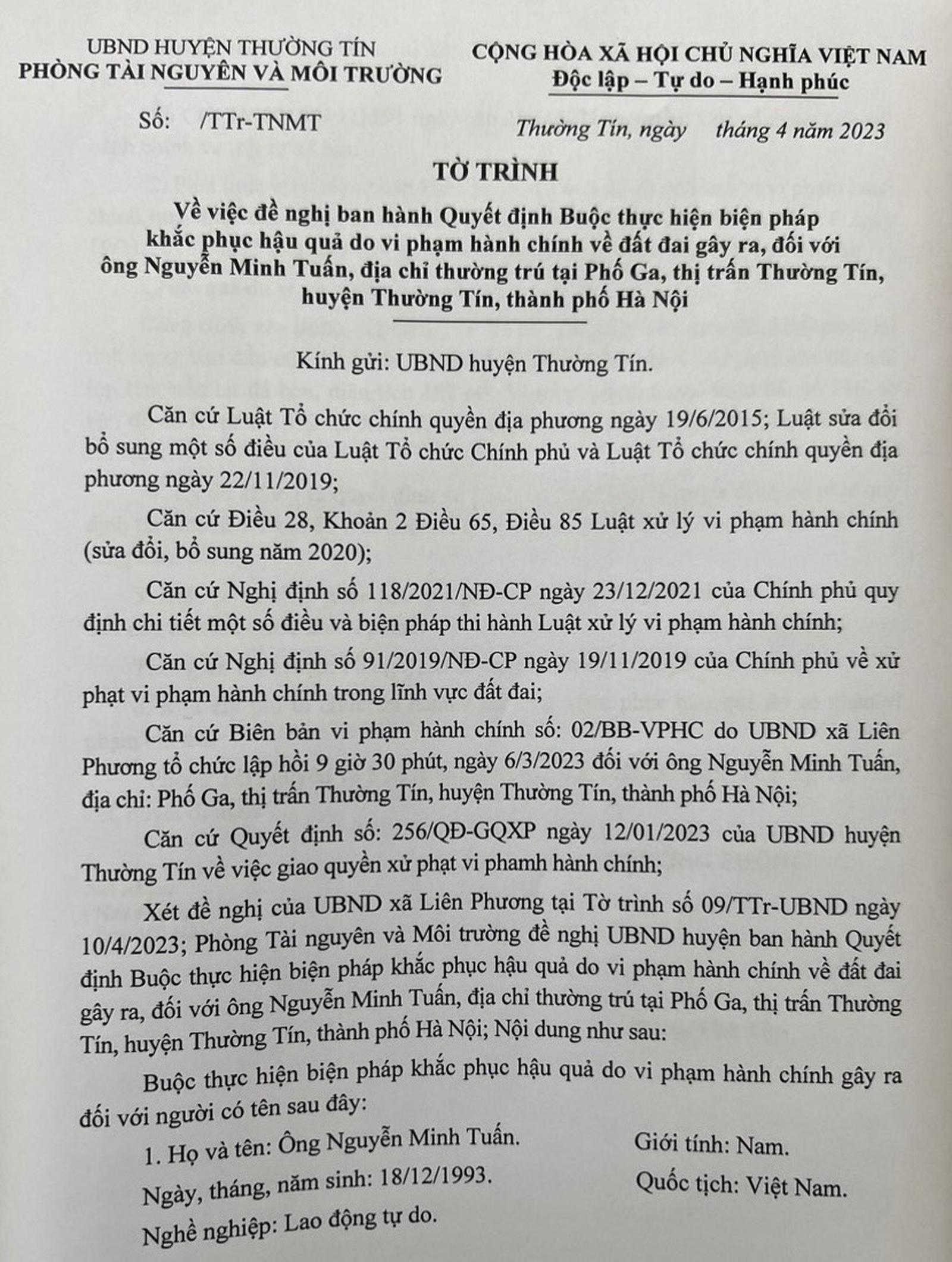 “Căn cứ các quy định pháp luật, hồ sơ của xã Liên Phương thiết lập, Phòng TN&MT đang dự thảo tờ trình đề nghị UBND huyện ban hành quyết định buộc thực hiện biện pháp khắc phục hậu quả do vi phạm hành chính về đất đai gây ra đối với ông Nguyễn Minh Tuấn” - ông Việt cho biết.