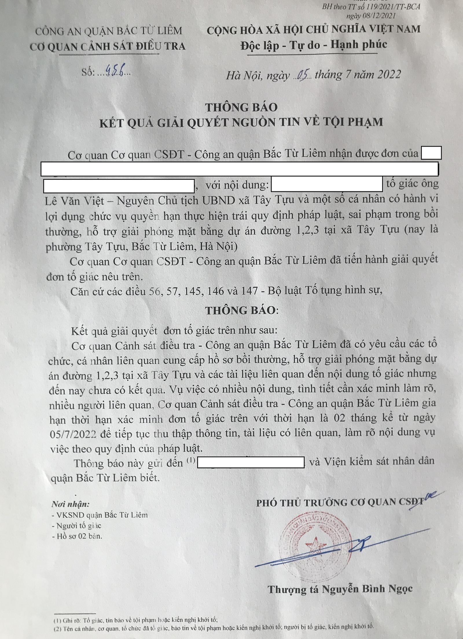 Ở một diễn biến khác, vào ngày 5/7/2022, Cơ quan Điều tra, Công an quận Bắc Từ Liêm đã ra Thông báo số 456 cho biết: Đối với nội dung tố giác ông Lê Văn Việt - nguyên Chủ tịch UBND xã Tây Tựu và một số cá nhân có hành vi lợi dụng chức vụ quyền hạn thực hiện trái quy định pháp luật, sai phạm trong bồi thường hỗ trợ, giải phóng mặt bằng dự án đường 1,2,3 tại xã Tây Tựu (nay là phường Tây Tựu, quận Bắc Từ Liêm), cơ quan cảnh sát đã có yêu cầu tổ chức, cá nhân liên quan cung cấp hồ sơ nhưng chưa có kết quả.