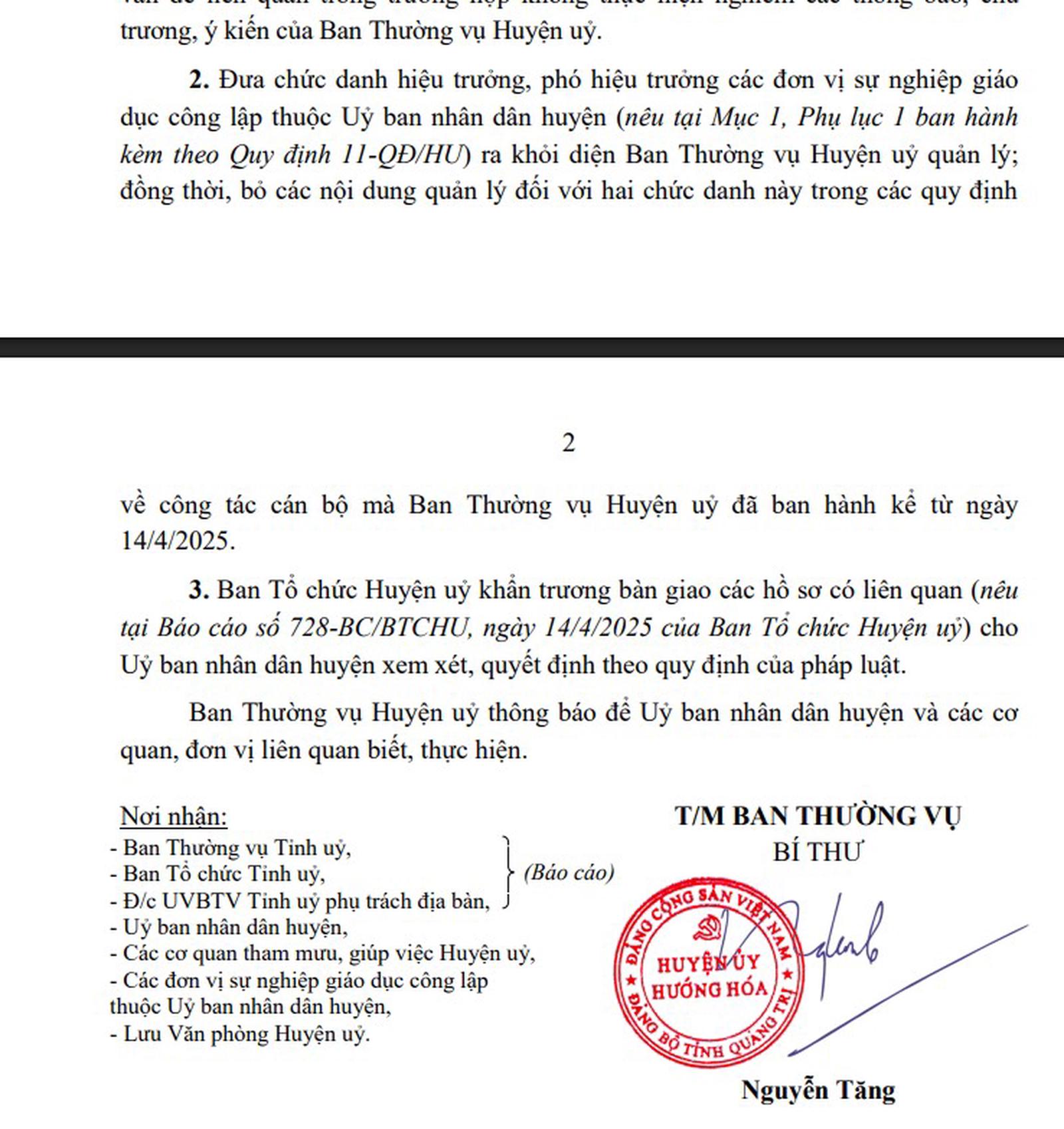 Trước những ý kiến chỉ đạo của lãnh đạo địa phương, tại Thông báo số 1197-TB/HU của BTV Huyện ủy Hướng Hóa đã thống nhất với các nội dung: Đưa chức danh Hiệu trưởng, Phó Hiệu trưởng các đơn vị sự nghiệp giáo dục công lập ra khỏi diện BTV Huyện ủy quản lý; bỏ các nội dung liên quan đến hai chức danh này trong các quy định về công tác cán bộ; chuyển giao toàn bộ hồ sơ, quyền quyết định về công tác cán bộ trong lĩnh vực này cho UBND huyện theo đúng quy định của pháp luật.