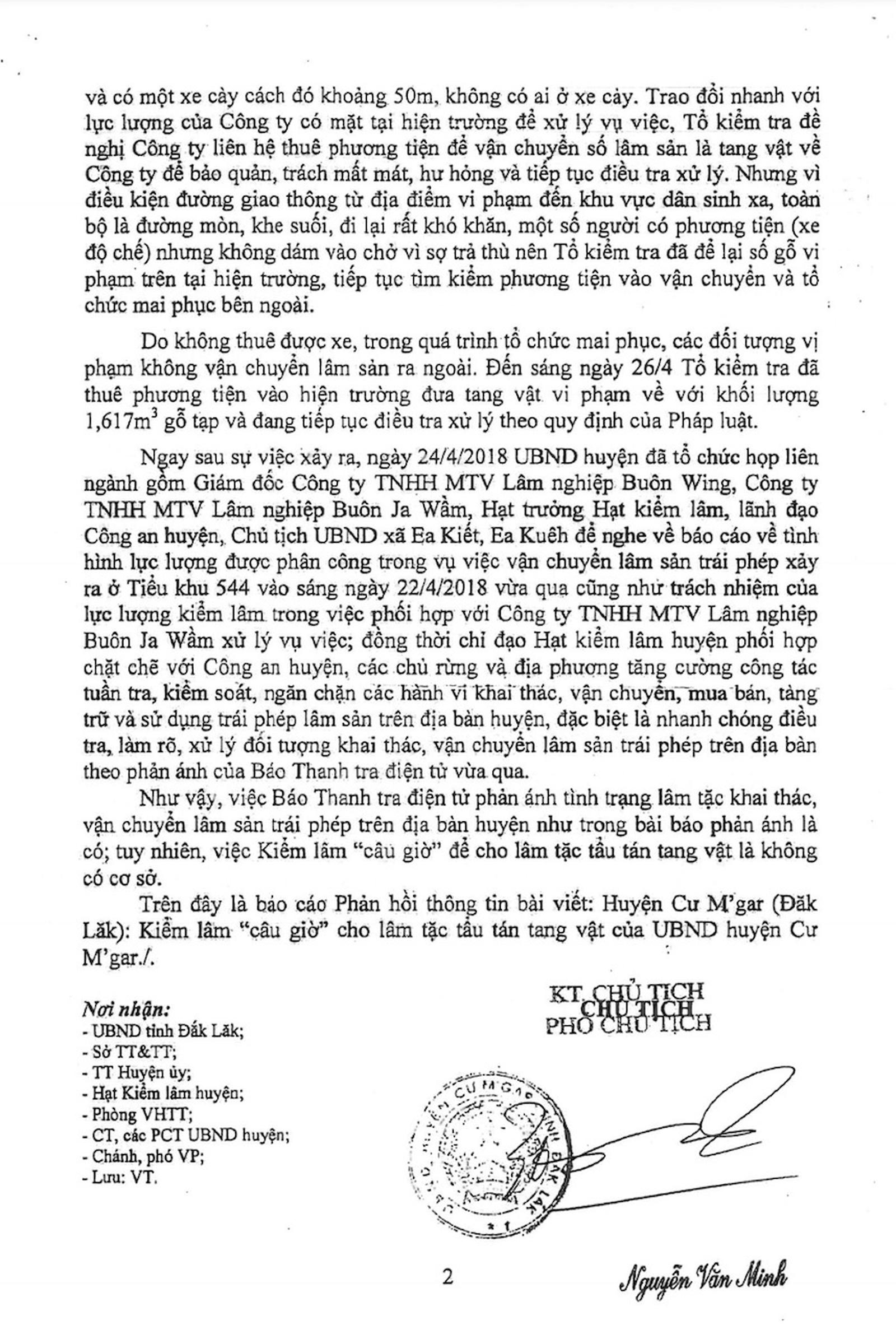 Ngày 03/5/2018, UBND huyện CưM’gar có Báo cáo số 117/BC-UBND về việc phản hồi thông tin bài viết: “Huyện CưM’gar (Đắk Lắk): Kiểm lâm ‘câu giờ’ cho lâm tặc tẩu tán tang vật”.