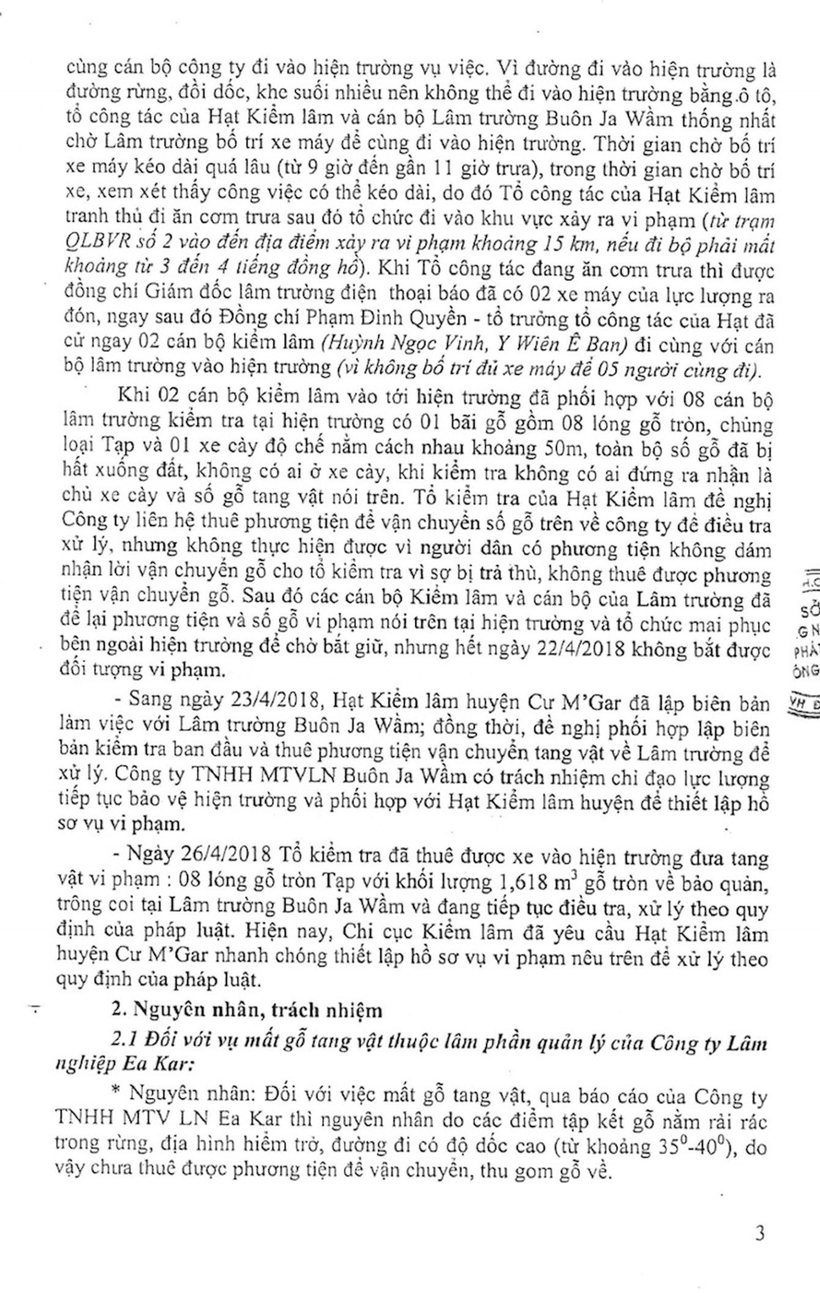 Cùng với quan điểm này, Báo cáo số 106/BC-SNN của Sở Nông nghiệp và Phát triển nông thôn tỉnh Đắk Lắk do Phó Giám đốc Vũ Văn Đông ký, gửi các cơ quan chức năng liên quan có đoạn viết: “Thời gian chờ bố trí xe máy kéo dài quá lâu (từ 9 giờ đến gần 11 giờ trưa), trong thời gian chờ bố trí xe, xem xét thấy công việc có thể kéo dài, do đó tổ công tác của Hạt Kiểm lâm tranh thủ đi ăn cơm trưa sau đó tổ chức đi vào khu vực xảy ra vi phạm”.