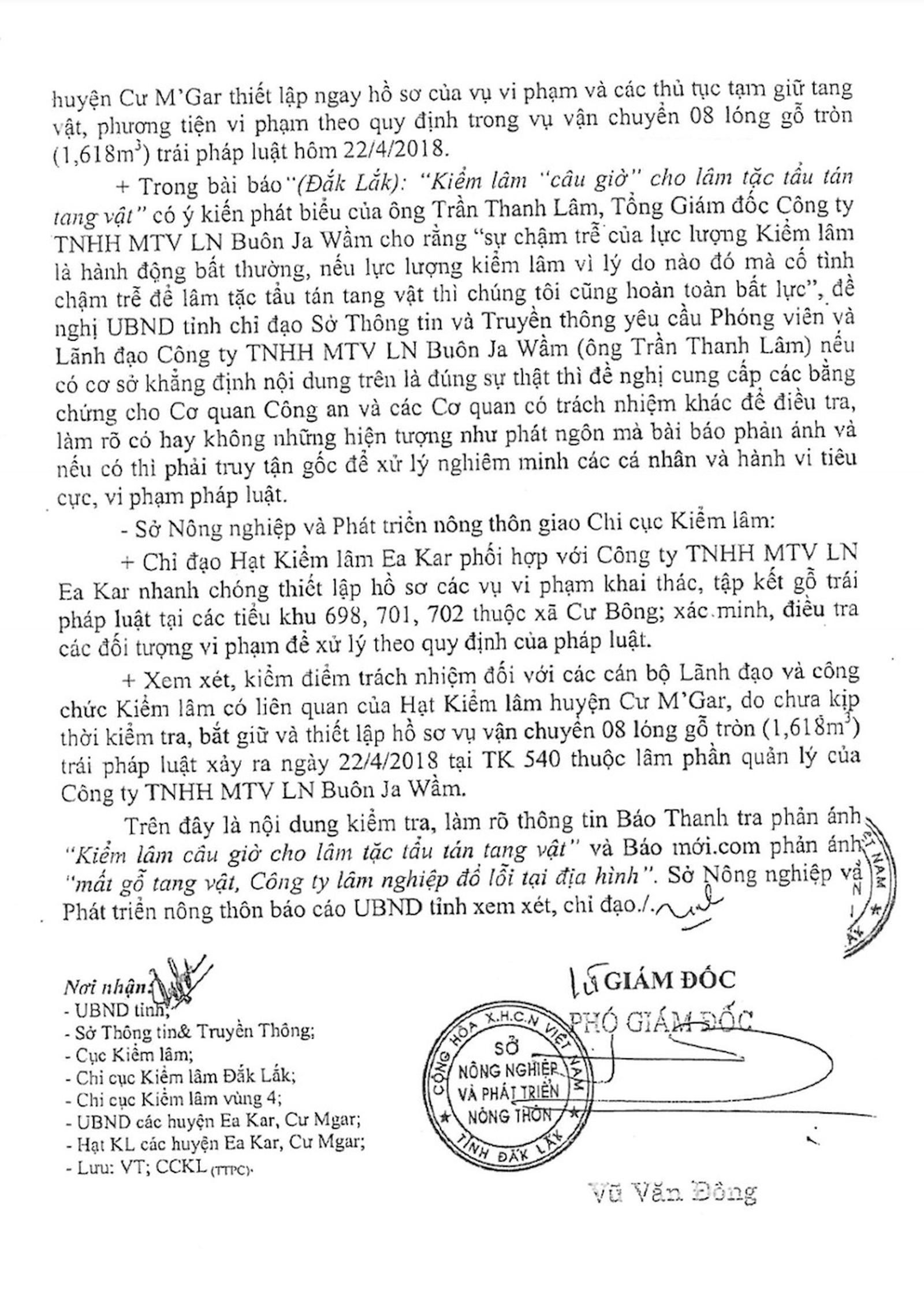 Cũng quan điểm giải trình này, Báo cáo số 106/BC-SNN, ngoài việc phản hồi thông tin trên Báo Thanh tra, Sở Nông nghiệp và Phát triển nông thôn tỉnh Đắk Lắk còn báo cáo kết quả xác minh vụ làm mất gần 8m3 gỗ tang vật xảy ra tại huyện Ea Kar.