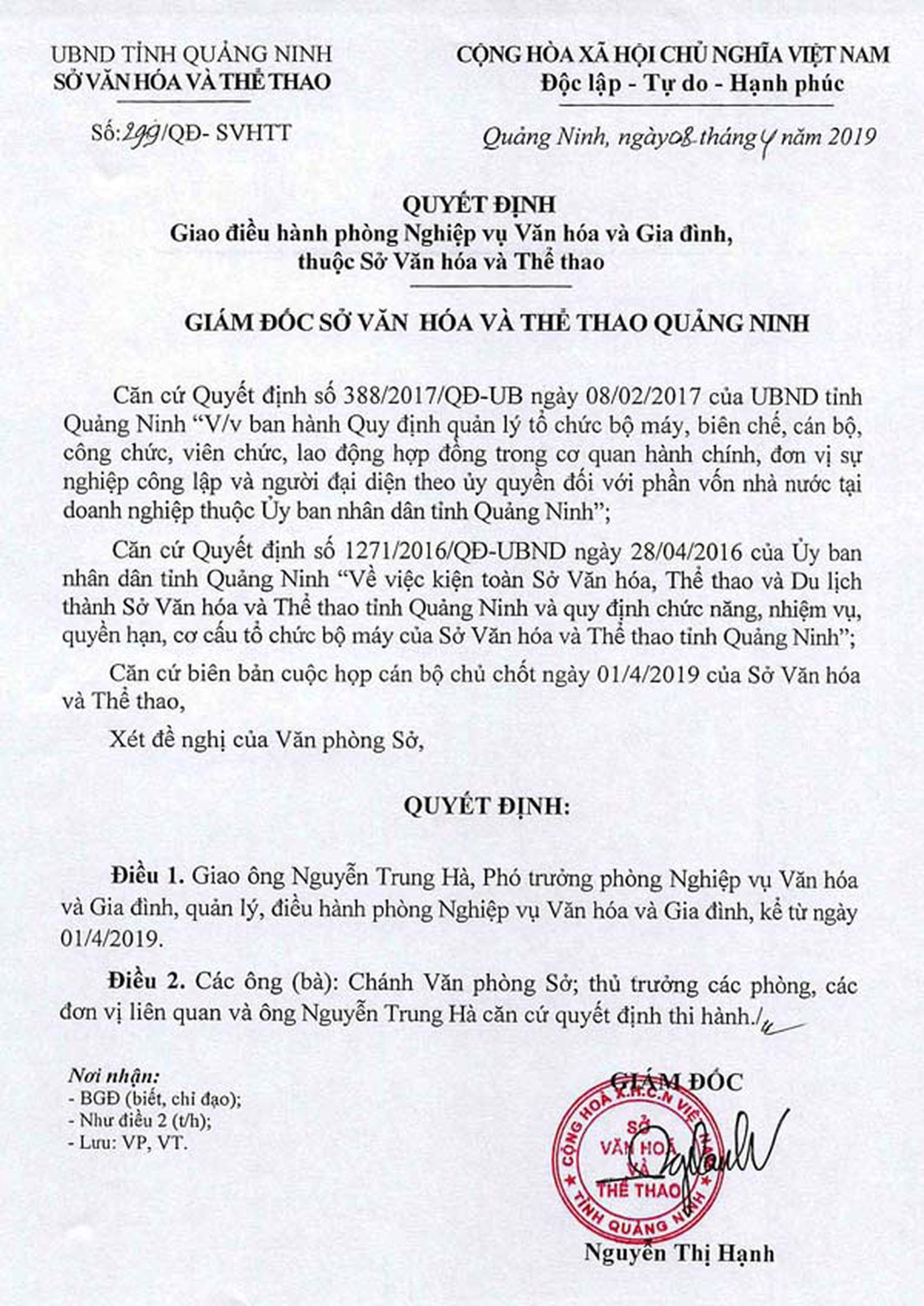 Mới đây, Giám đốc Sở VH&TT Quảng Ninh Nguyễn Thị Hạnh ký Quyết định số 299/QĐ-SVHTT, ngày 8/4/2019 giao trọng trách quản lý, điều hành Phòng Nghiệp vụ Văn hóa và Gia đình.